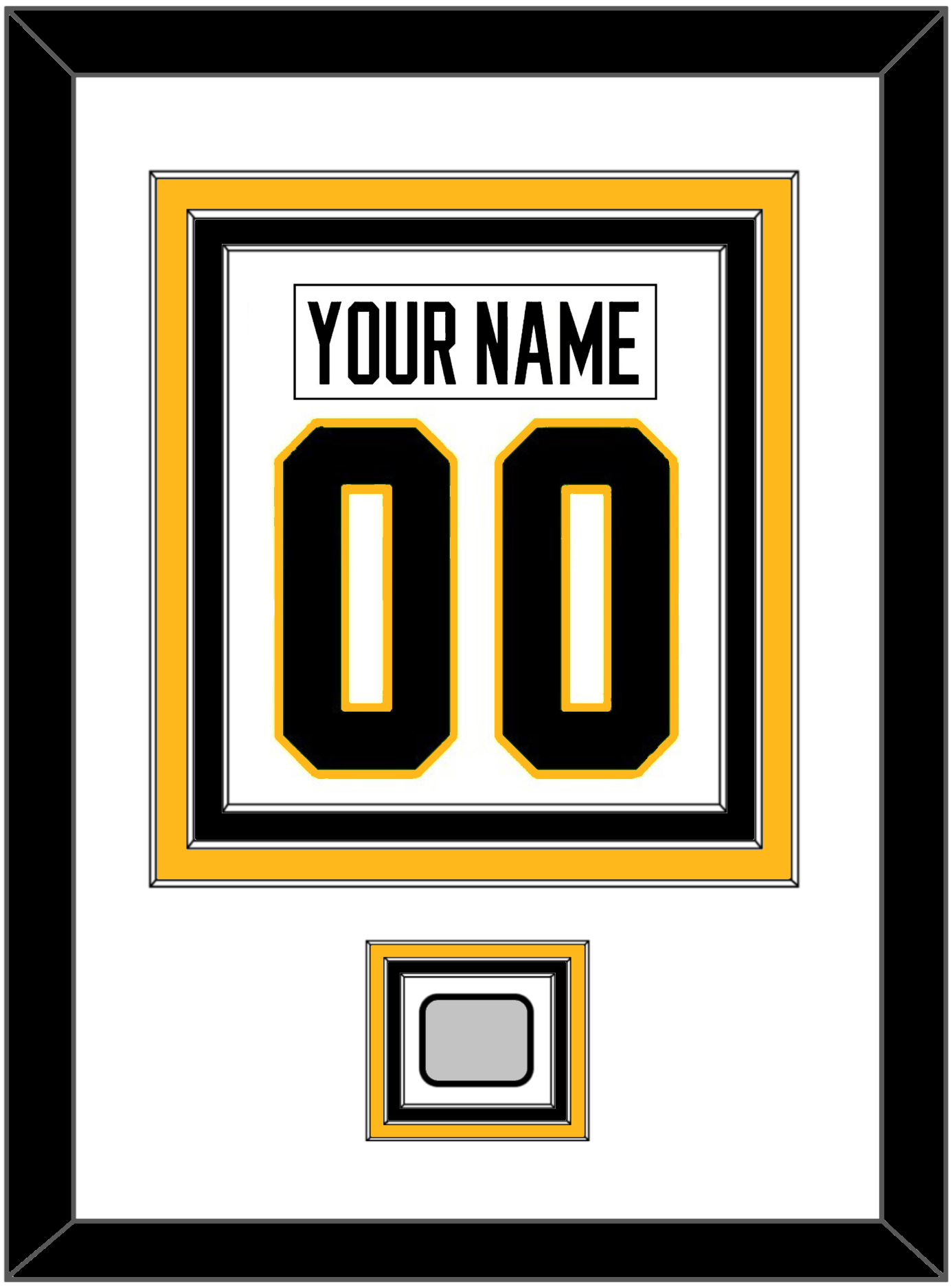 Pittsburgh Road White Jersey Nameplate & Number (From The Back Of The Jersey) With A Stanley Cup Finals Patch: 1991, 1992, 2009, 2016 Or 2017. Triple Mat Cut: White Mat Over A Gold Mat Over A Black Mat. White Nameplate, Black Number & Patch Mounted On A White Mat. Black Frame.