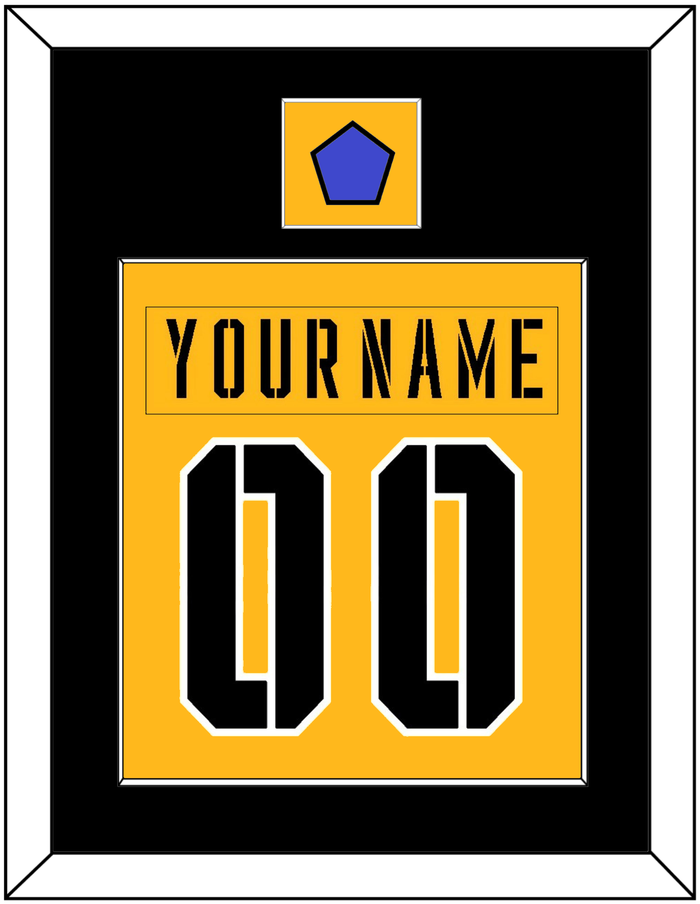 Pittsburgh 2017 Stadium Series Gold Jersey Nameplate & Number (From The Back Of The Jersey). Single Mat Cut: Black Mat With Gold Nameplate, Black Number & Patch Mounted On A Gold Mat. White Frame.