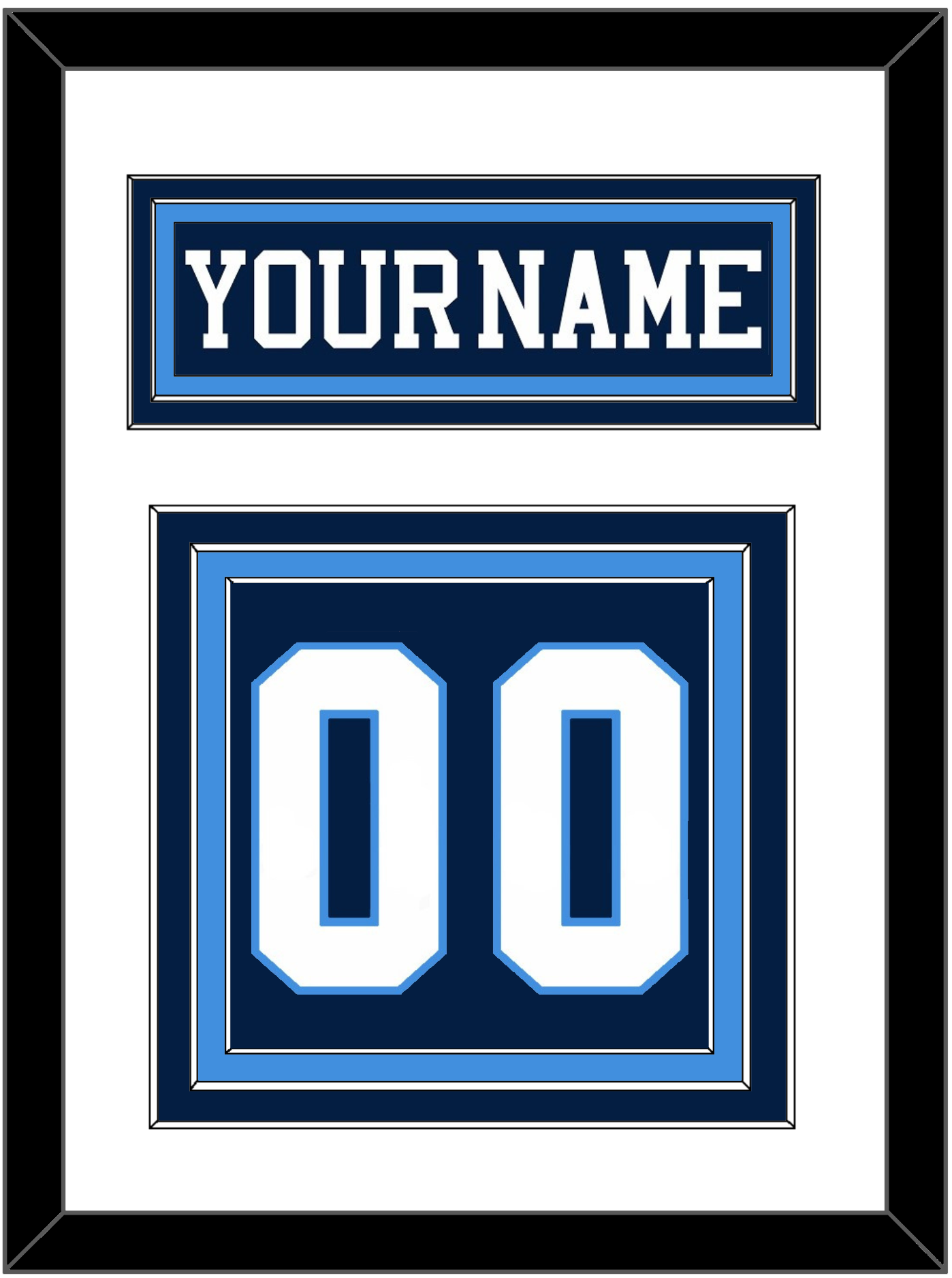 Pittsburgh Road Blue Jersey (1977 Through 1980) Nameplate & Numbers (From The Back Of The Jersey).  Nameplate Is Double Mat Cut:  White Mat Over A Blue Mat.  Blue Nameplate Mounted On A Powder Blue Mat.  To Match The Jersey, Number Is Triple Mat Cut:  White Mat Over A Blue Mat Over A Powder Blue Mat, White Number Mounted On A Blue Mat.  Black Frame.