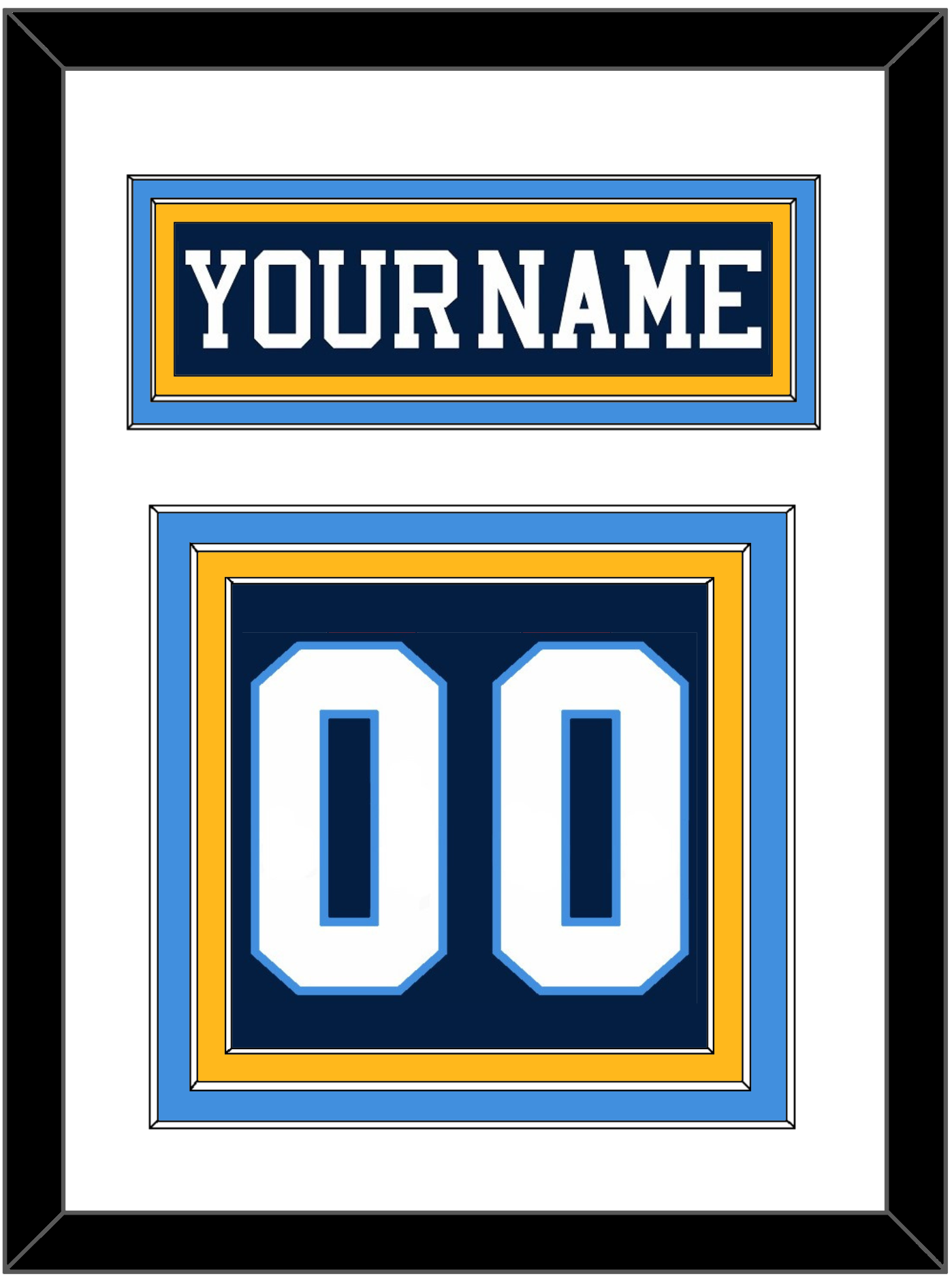 Pittsburgh Road Blue Jersey (1977 Through 1980) Nameplate & Numbers (From The Back Of The Jersey). Nameplate Is Double Mat Cut: White Mat Over A Powder Blue Mat. Blue Nameplate Mounted On A Gold Mat. To Match The Jersey, Number Is Triple Mat Cut: White Mat Over A Powder Blue Mat Over A Gold Mat, White Number Mounted On A Blue Mat. Black Frame.