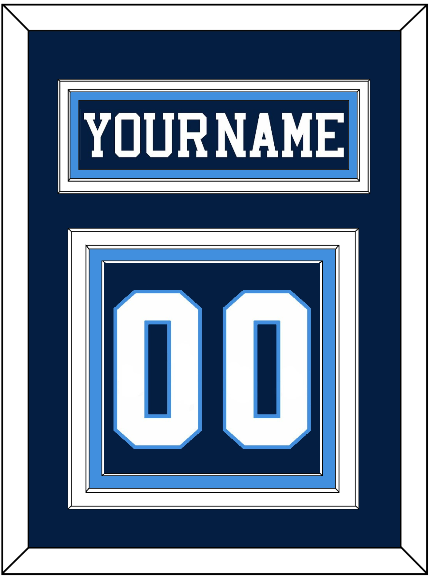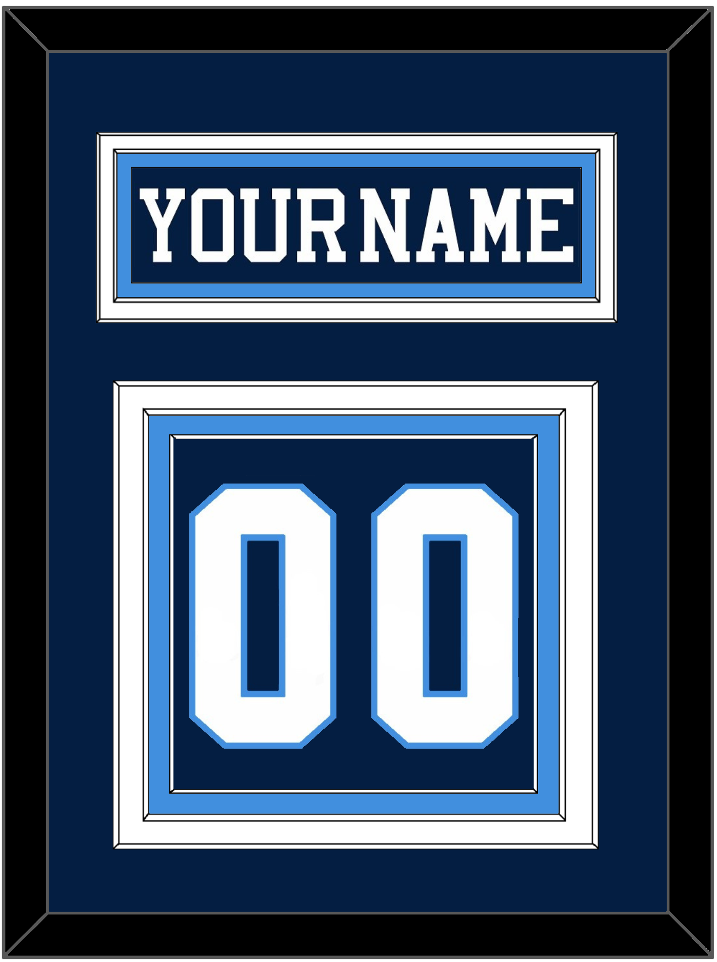 Pittsburgh Road Blue Jersey (1977 Through 1980) Nameplate & Numbers (From The Back Of The Jersey). Nameplate Is Double Mat Cut: Blue Mat Over A White Mat. Blue Nameplate Mounted On A Powder Blue Mat. To Match The Jersey, Number Is Triple Mat Cut: Blue Mat Over A White Mat Over A Powder Blue Mat, White Number Mounted On A Blue Mat. White Or Black Frame.