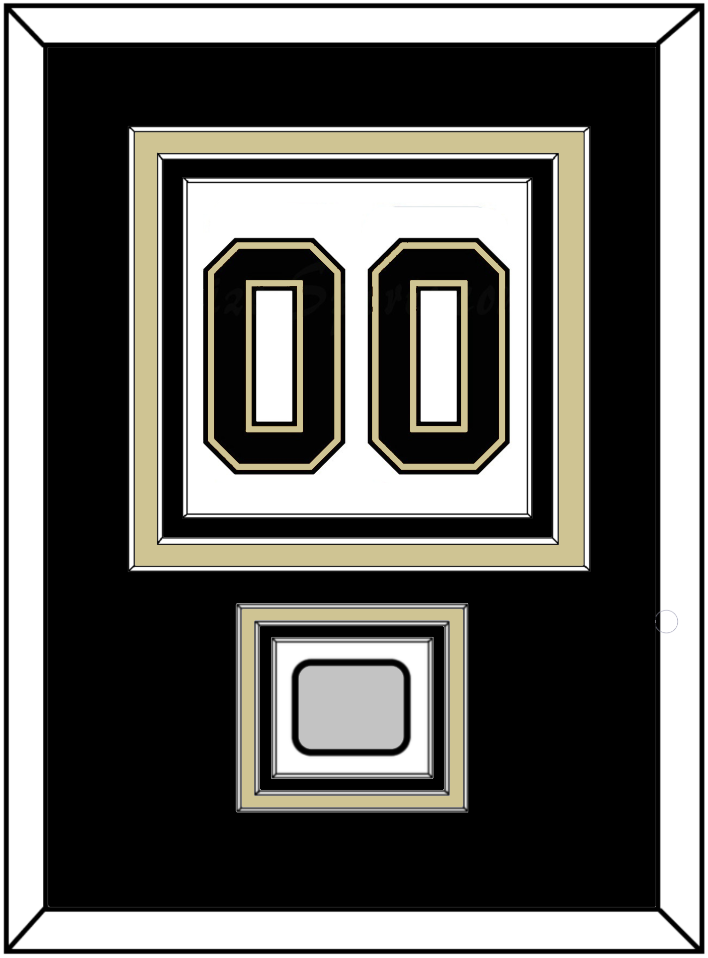 Pittsburgh Road White Jersey (2007 Through 2016) Number (From The Back Of The Jersey) With A 1991, 1992, 2009, 2016 Or 2017 Stanley Cup Champions Patch. Triple Mat Cut: Black Mat Over A Gold Mat Over A Black Mat. Black Number & Patch Mounted On A White Mat. White Frame.