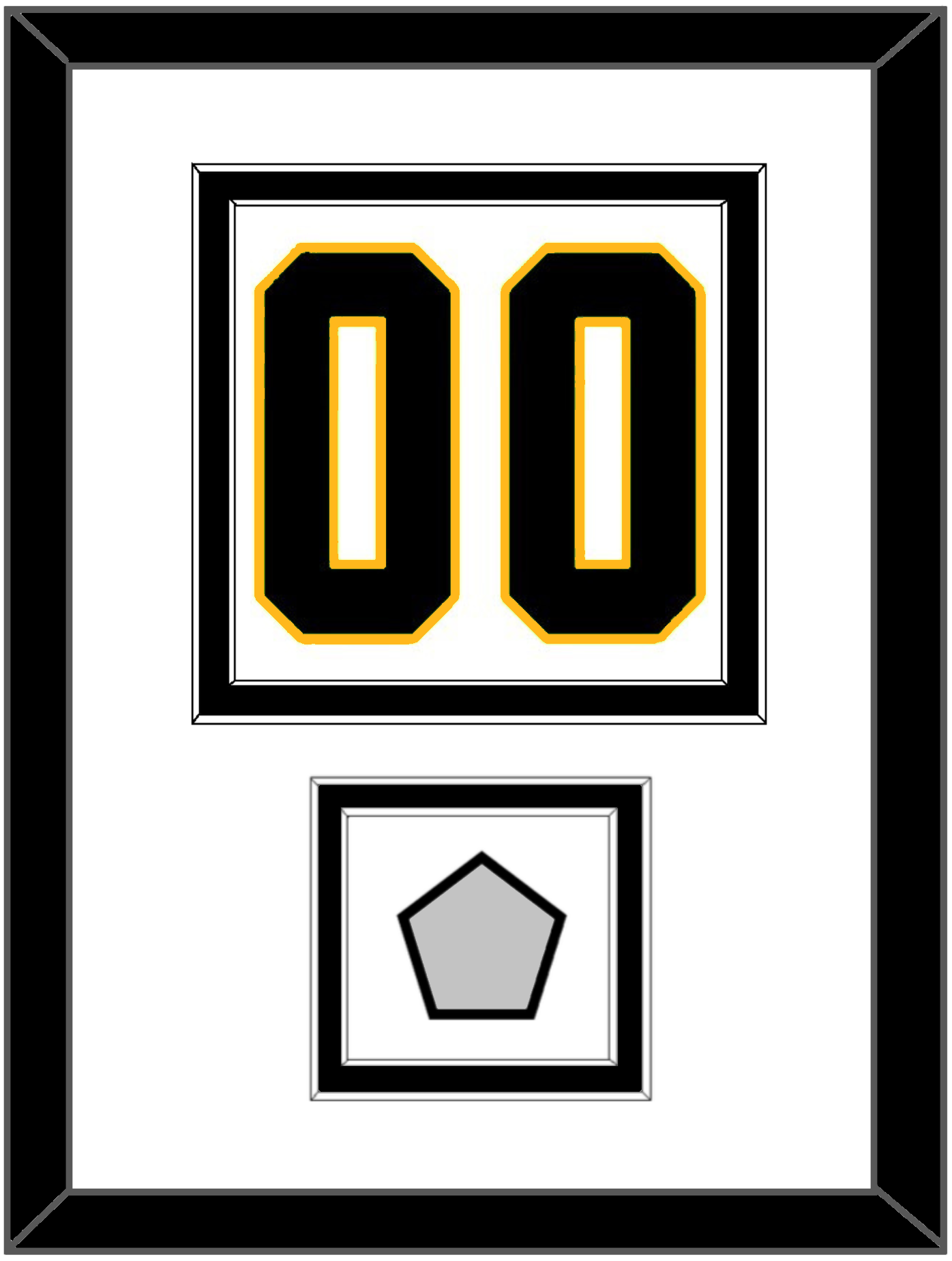 Pittsburgh Road White Jersey Number (From The Back Of The Jersey) With A 1991, 1992, 2009, 2016 Or 2017 Stanley Cup Champions Patch. Double Mat Cut: White Mat Over A Black Mat. Black Number & Patch Mounted On A White Mat. Black Frame.