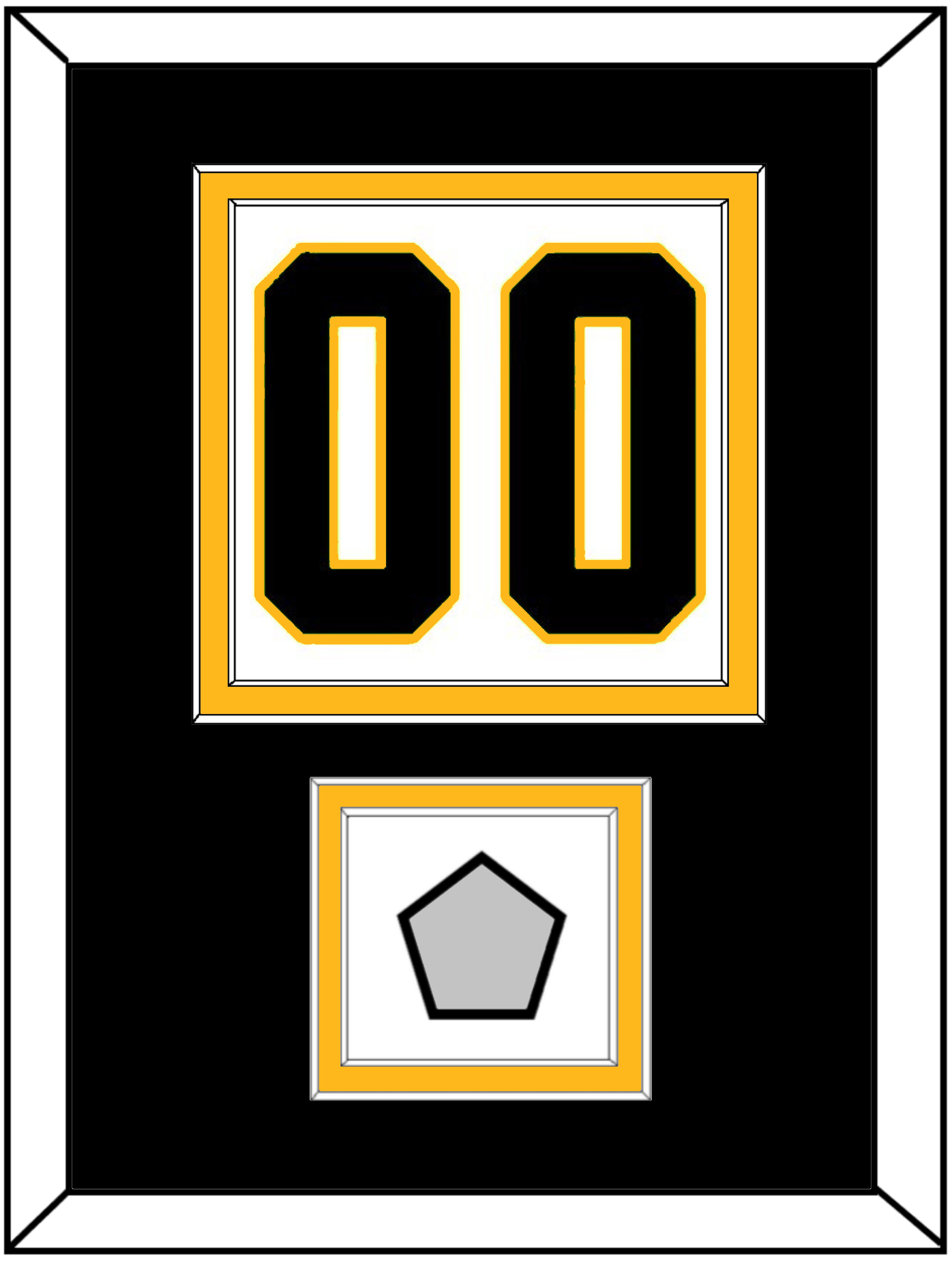 Pittsburgh Road White Jersey Number (From The Back Of The Jersey) With A 1991, 1992, 2009, 2016 Or 2017 Stanley Cup Champions Patch. Double Mat Cut: Black Mat Over A Gold Mat. Black Number & Patch Mounted On A White Mat. White Frame.
