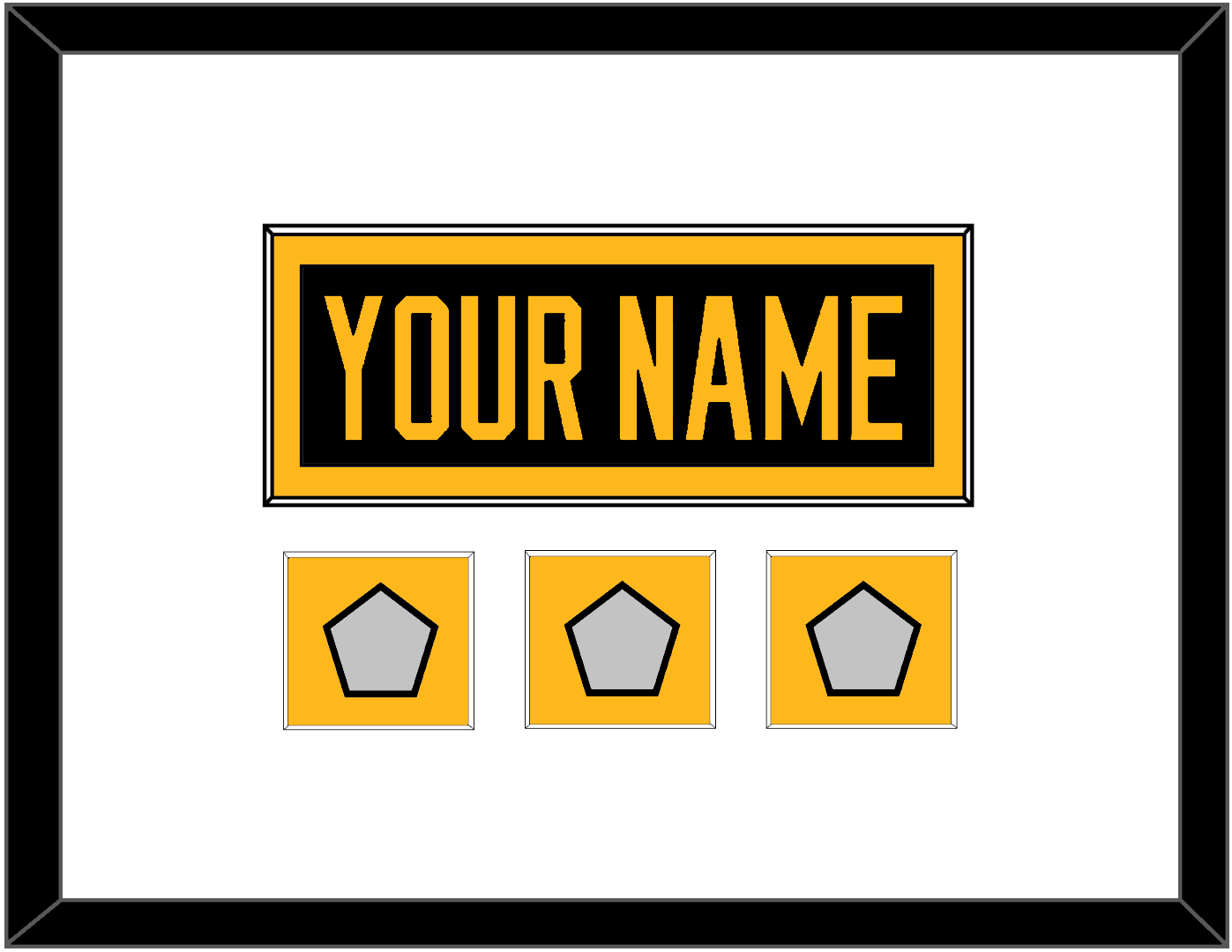 Pittsburgh Home Black Jersey Nameplate With 2009, 2016 & 2017 Stanley Cup Finals Patches. Single Mat Cut: White Mat With Black Nameplate & Patches Mounted On A Gold Mat. Black Frame.