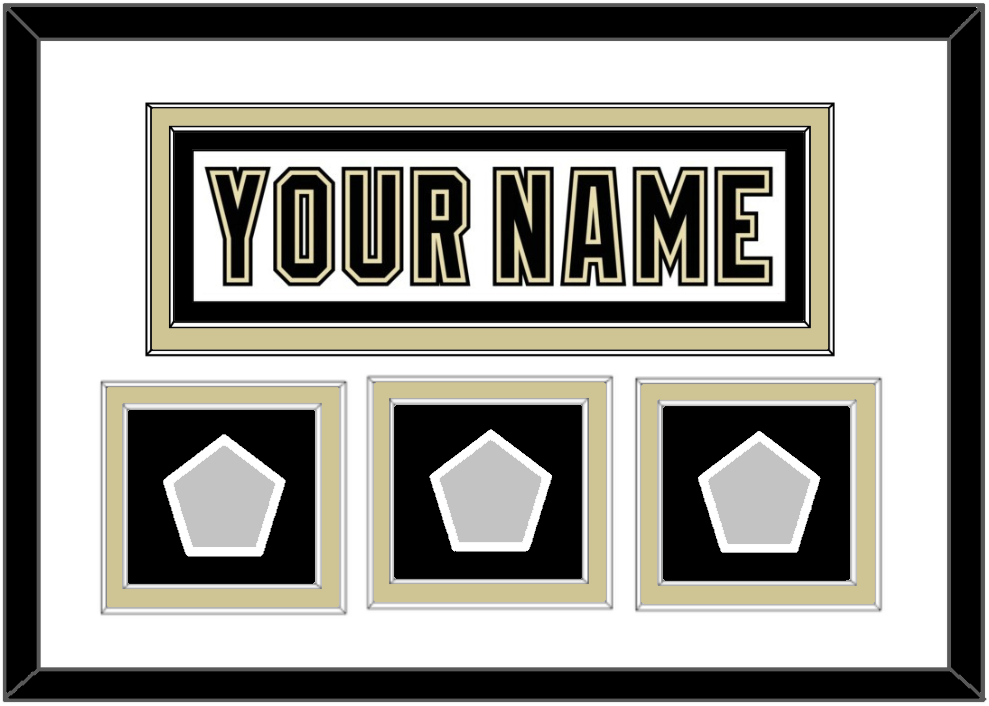 Pittsburgh Road White Jersey (2007 Through 2016) Nameplate With 2009, 2016 & 2017 Stanley Cup Finals Patches. Double Mat Cut: White Mat Over A Gold Mat. White Nameplate & Patches Mounted On A Black Mat. Black Frame.