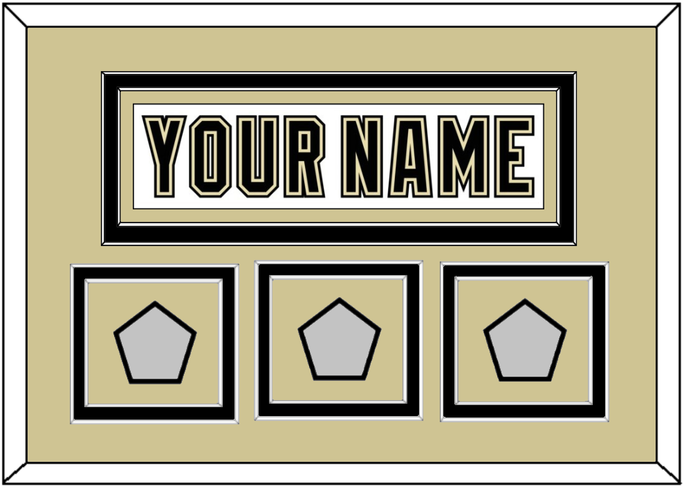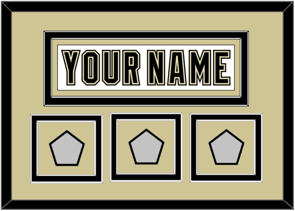 Pittsburgh Road White Jersey (2007 Through 2016) Nameplate With 2009, 2016 & 2017 Stanley Cup Finals Patches. Double Mat Cut: Gold Mat Over A Black Mat. White Nameplate & Patches Mounted On A Gold Mat. Black Or White Frame.