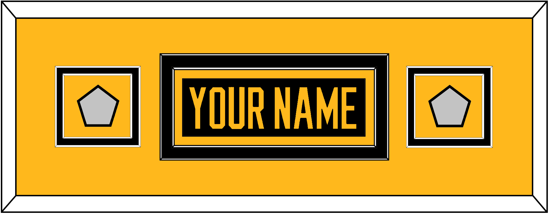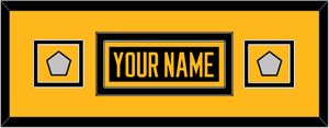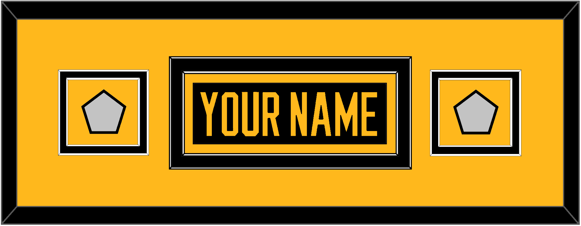 Pittsburgh Home Black Jersey Nameplate With 2 Stanley Cup Champions Patches (1991 & 1992, 2009 & 2016 Or 2016 & 2017). Double Mat Cut: Gold Mat Over A Black Mat. Black Nameplate & Patches Mounted On A Gold Mat. Black Or White Frame.