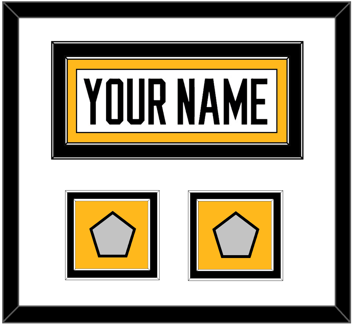 Pittsburgh Road White Jersey Nameplate With 2 Stanley Cup Champions Patches (1991 & 1992, 2009 & 2016 Or 2016 & 2017). Double Mat Cut: White Mat Over A Black Mat. White Nameplate & Patches Mounted On A Gold Mat. Black Frame.
