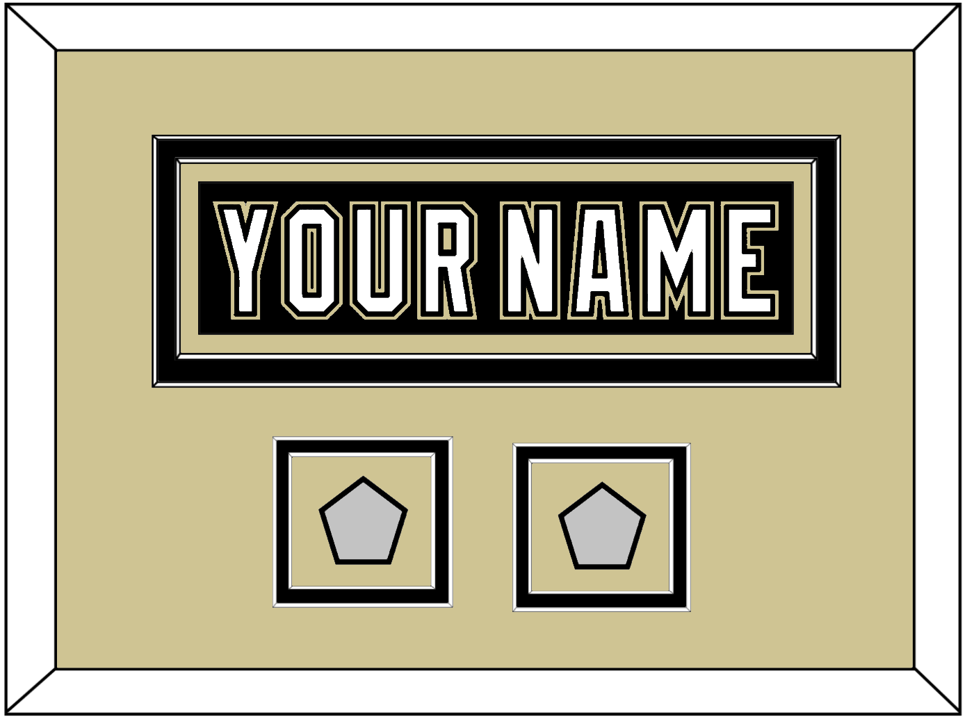 Pittsburgh Home Black Jersey (2007 Through 2016) Nameplate With 2 Stanley Cup Champions Patches (1991 & 1992, 2009 & 2016 Or 2016 & 2017). Double Mat Cut: Gold Mat Over A Black Mat. Black Nameplate & Patches Mounted On A Gold Mat. Black Or White Frame.