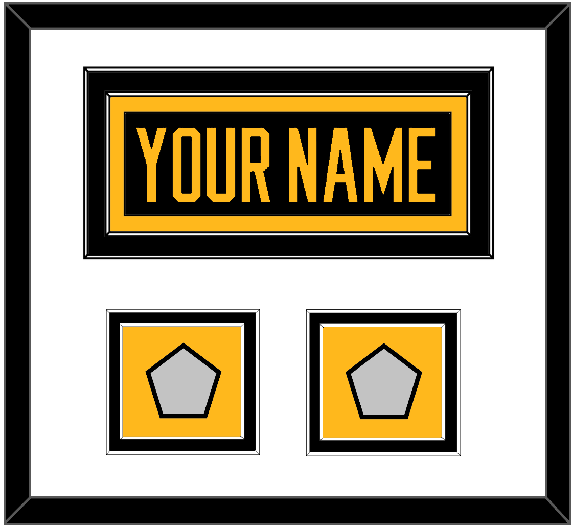 Pittsburgh Home Black Jersey Nameplate With 2 Stanley Cup Finals Patches (1991 & 1992, 2009 & 2016 Or 2016 & 2017). Double Mat Cut: White Mat Over A Black Mat. Black Nameplate & Patches Mounted On A Gold Mat. Black Frame.