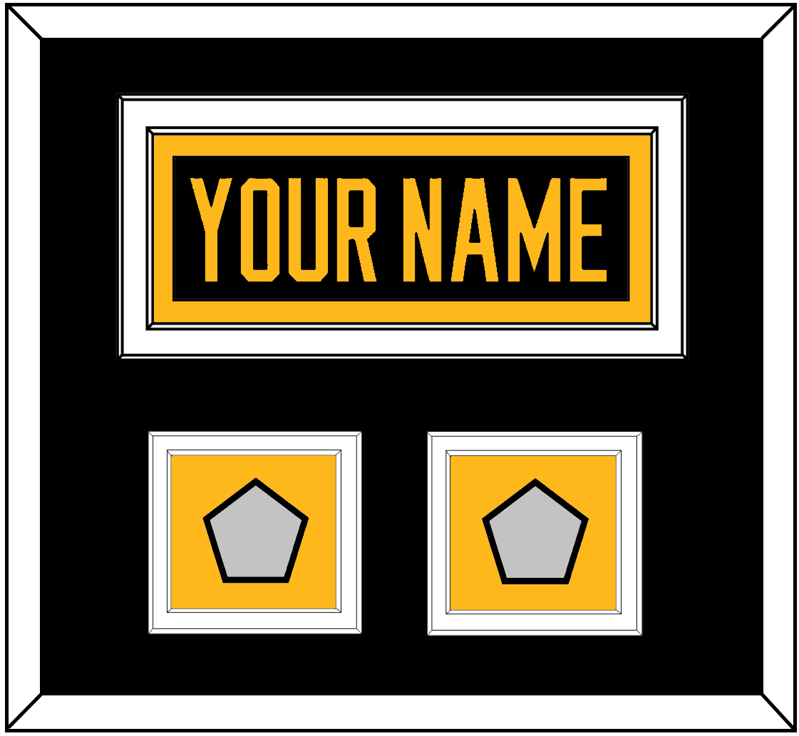 Pittsburgh Home Black Jersey Nameplate With 2 Stanley Cup Finals Patches (1991 & 1992, 2009 & 2016 Or 2016 & 2017). Double Mat Cut: Black Mat Over A White Mat. Black Nameplate & Patches Mounted On A Gold Mat. White Frame.