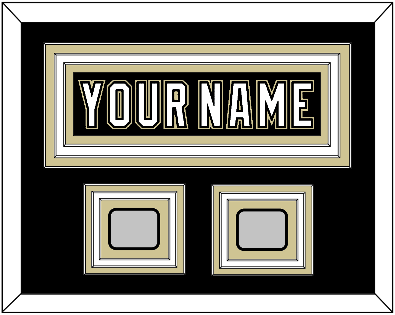 Pittsburgh Home Black Jersey (2007 Through 2016) Nameplate With 2 Stanley Cup Finals Jersey Patches (2009 & 2016 Or 2016 & 2017). Triple Mat Cut: Black Mat Over A Gold Mat Over A White Mat. Black Nameplate & Patches Mounted On A Gold Mat. White Frame.