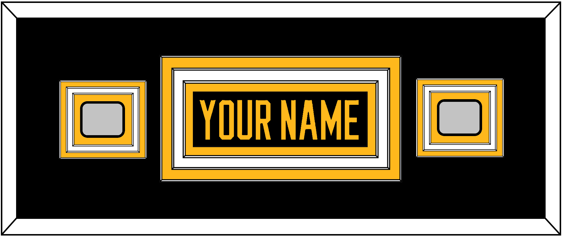 Pittsburgh Road Black Jersey (1988 Through 1992) Nameplate With 2 Stanley Cup Finals Jersey Patches (1991 & 1992, 2009 & 2016 Or 2016 & 2017). Triple Mat Cut: Black Mat Over A Gold Mat Over A White Mat. Black Nameplate & Patches Mounted On A Gold Mat. White Frame.
