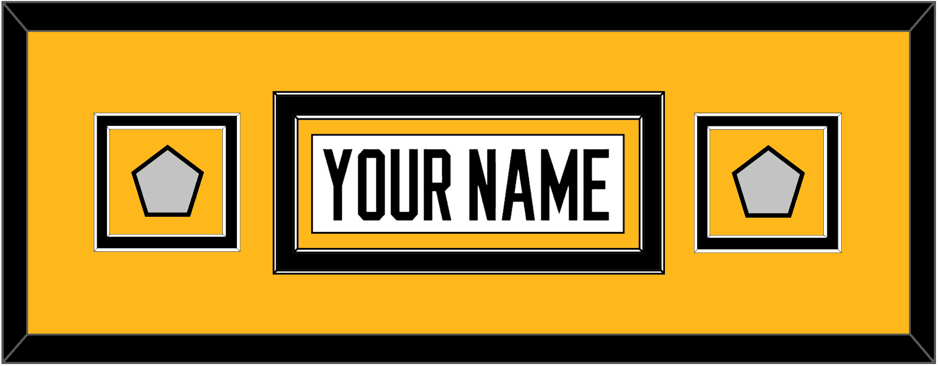 Pittsburgh Home White Jersey (1988 Through 1992) Nameplate With 2 Stanley Cup Finals Patches (1991 & 1992, 2009 & 2016 Or 2016 & 2017). Double Mat Cut: Gold Mat Over A Black Mat. White Nameplate & Patches Mounted On A Gold Mat. Black Or White Frame.