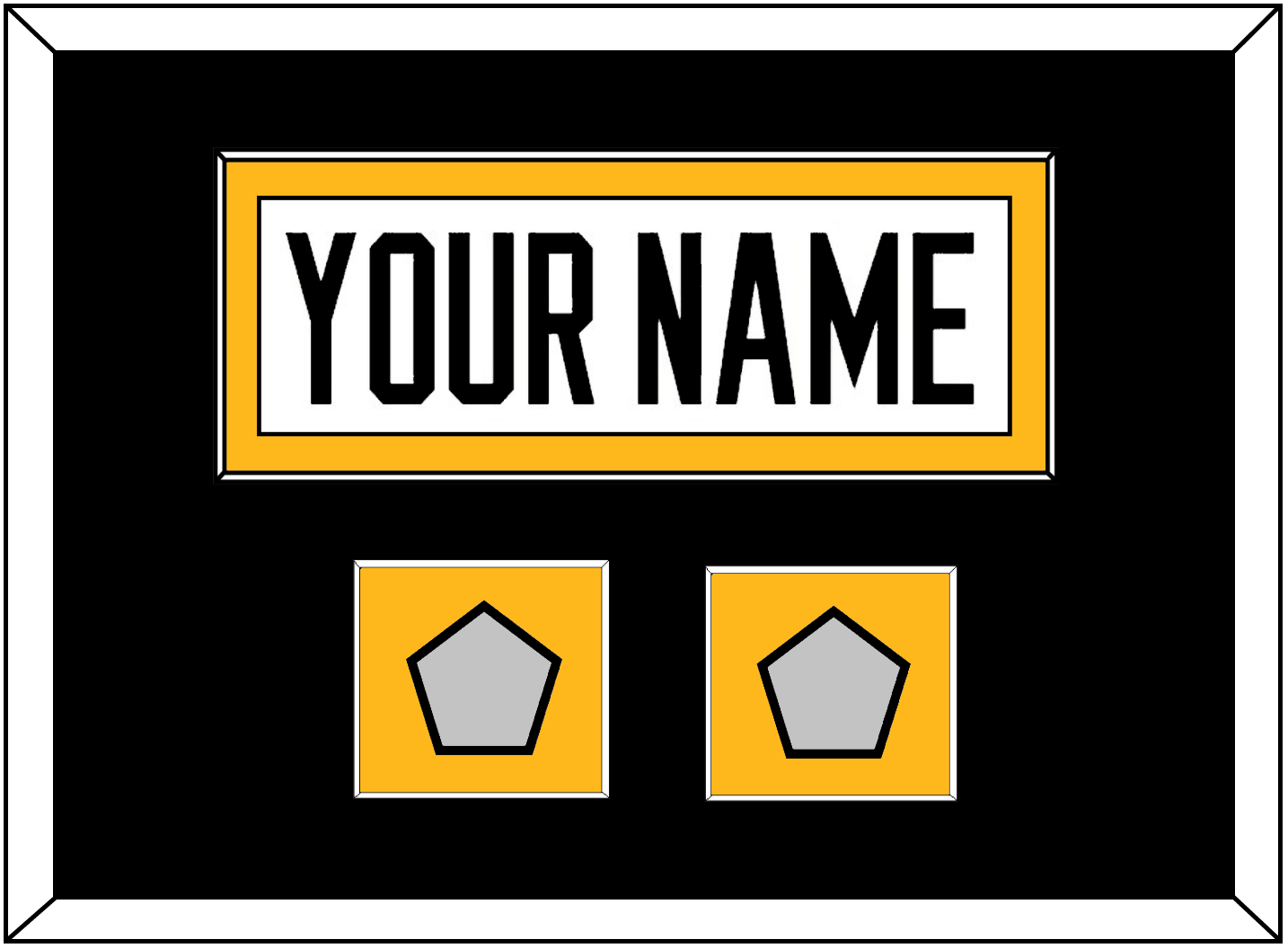 Pittsburgh Home White Jersey (1988 Through 1992) Nameplate With 2 Stanley Cup Champions Patches (1991 Or 1992, 2009 & 2016 Or 2016 & 2017). Single Mat Cut: Black Mat With White Nameplate & Patches Mounted On A Gold Mat. White Frame.