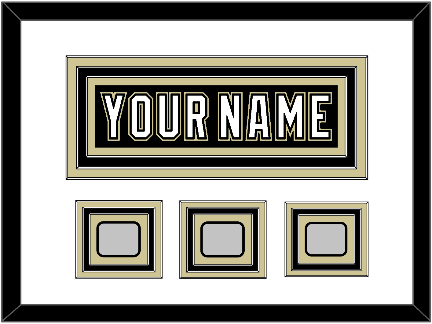Pittsburgh Home Black Jersey (2007 Through 2016) Nameplate With 2009, 2016 & 2017 Stanley Cup Finals Jersey Patches. Triple Mat Cut: White Mat Over A Gold Mat Over A Black Mat. Black Nameplate & Patches Mounted On A Gold Mat. Black Frame.