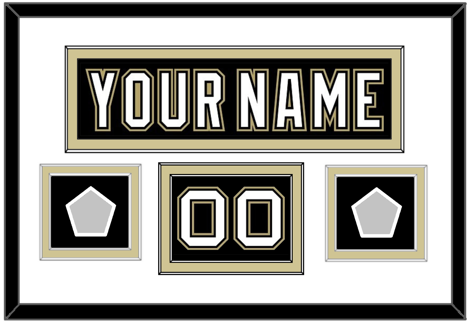 Pittsburgh Home Black Jersey (2007 Through 2016) Nameplate, Numbers From Shoulder, & 2 Stanley Cup Champions Patches (1991 & 1992, 2009 & 2016 Or 2016 & 2017). The Nameplate Is Single Mat Cut: Black Nameplate Mounted On Gold Mat. To Match The Jersey, The Numbers & Patches Are Double Mat Cut: White Mat Over A Gold Mat. White Numbers & Patches Mounted On A Black Mat. Black Frame.