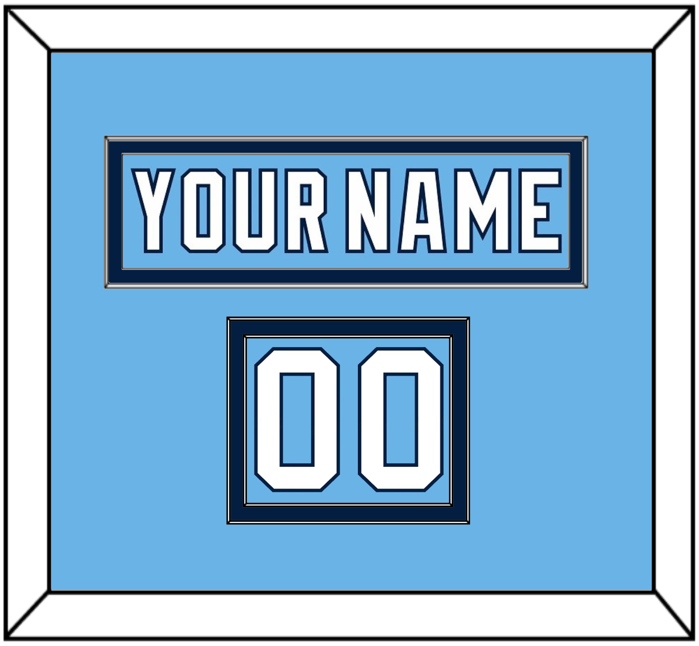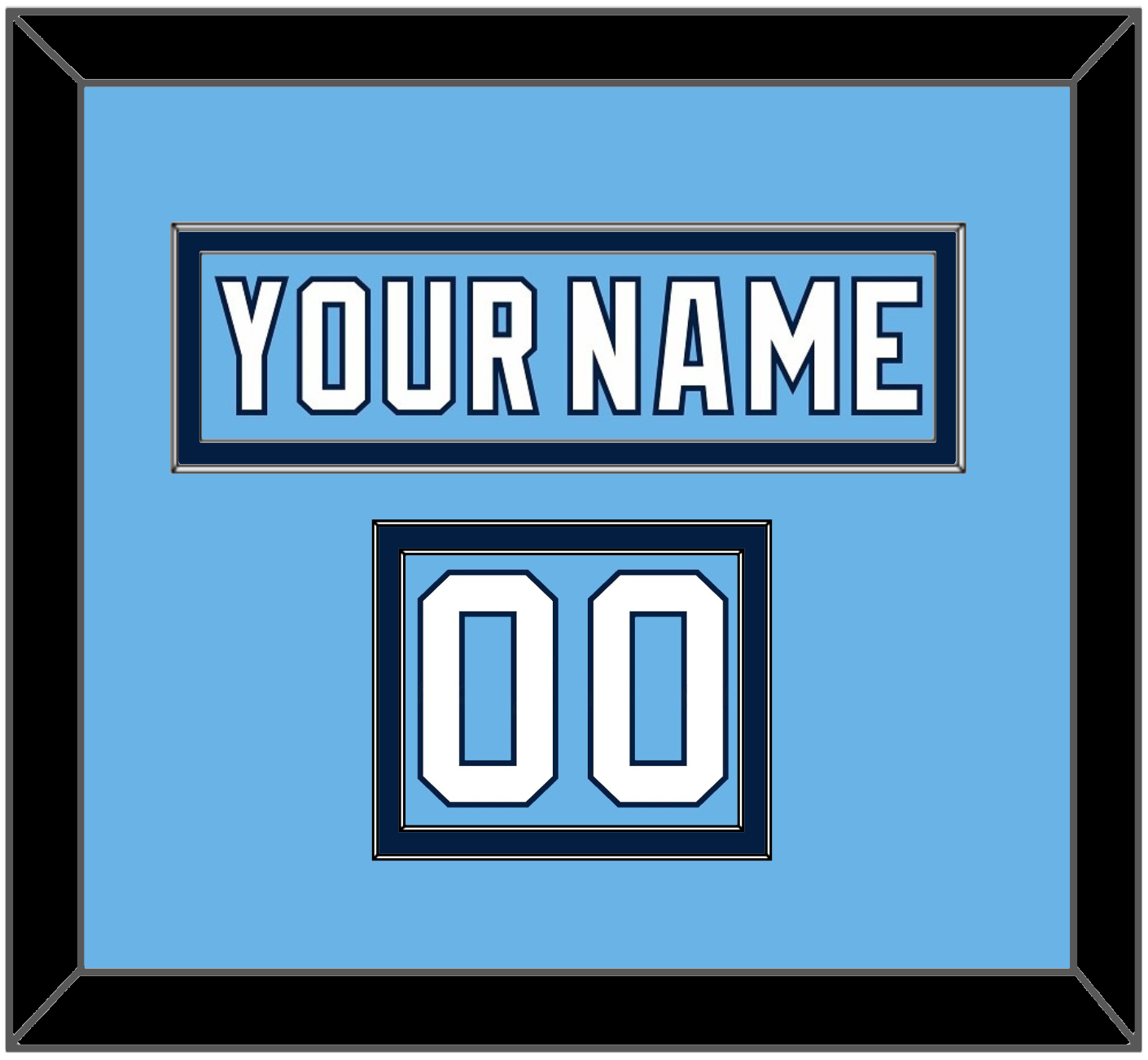 Pittsburgh 2008 Winter Classic Powder Blue Jersey Nameplate & Numbers From Shoulder - The Nameplate Is Single Mat Cut: Powder Blue Nameplate Mounted On Blue Mat. To Match The Jersey, The Numbers Are Double Mat Cut: Powder Blue Mat Over A Blue Mat, White Numbers Mounted On A Powder Blue Mat. White Or Black Frame.