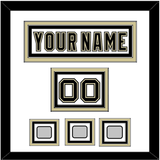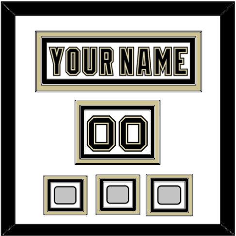 Pittsburgh Road White Jersey (2007 Through 2016) Nameplate, Numbers From Shoulder, And 2009, 2016 & 2017 Stanley Cup Champions Patches. The Nameplate Is Double Mat Cut: White Mat Over A Gold Mat. White Nameplate Mounted On A Black Mat. To Match The Jersey, Numbers And Patches Are Triple Mat: White Mat Over A Gold Mat Over A Black Mat. Black Numbers And Patches Are Mounted On White Mat. Black Frame.