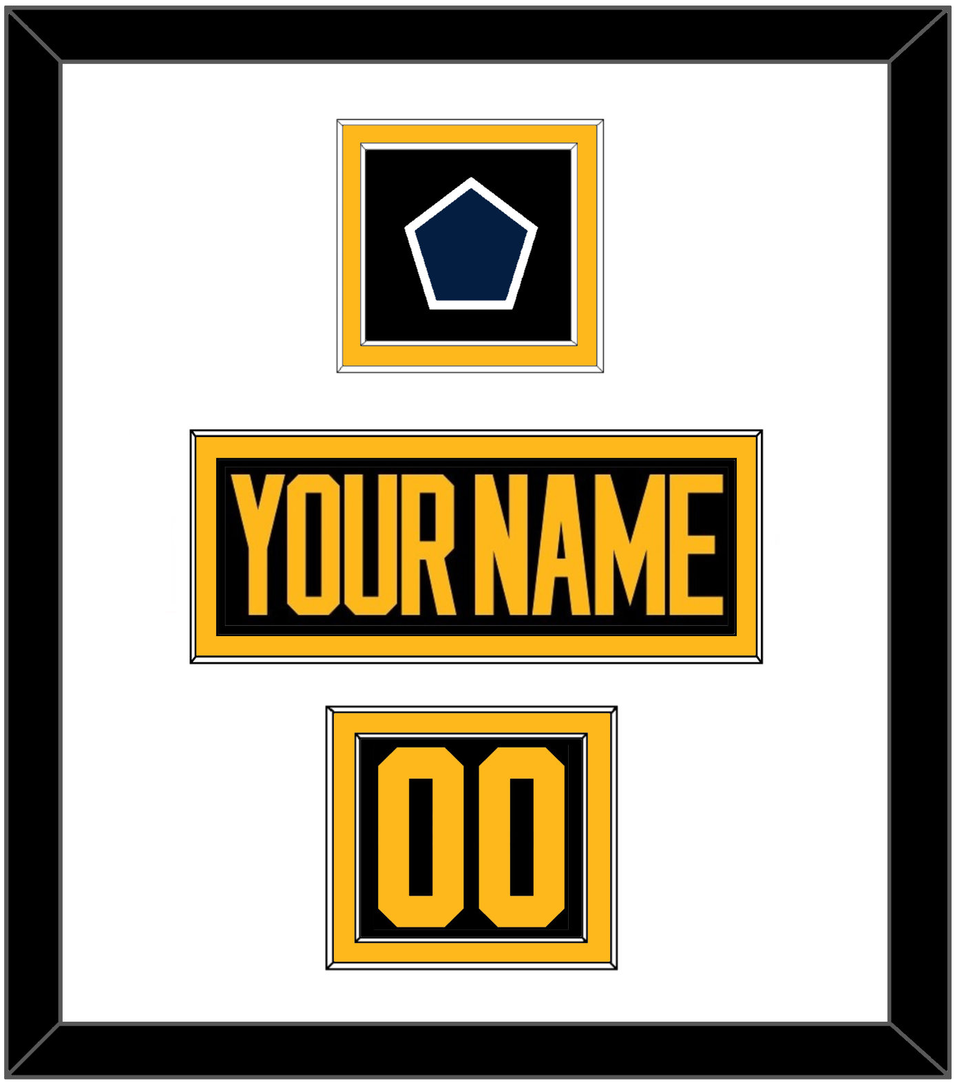 Pittsburgh 2019 Stadium Series Black Jersey Nameplate, Number(s) From Shoulder, & Game Patch From Shoulder. The Nameplate Is Single Mat Cut: Black Nameplate Mounted On A Gold Mat. To Match The Jersey, The Numbers & Patches Are Double Mat Cut: White Mat Over A Gold Mat, Gold Numbers & Patch Mounted On A Black Mat. Black Frame.