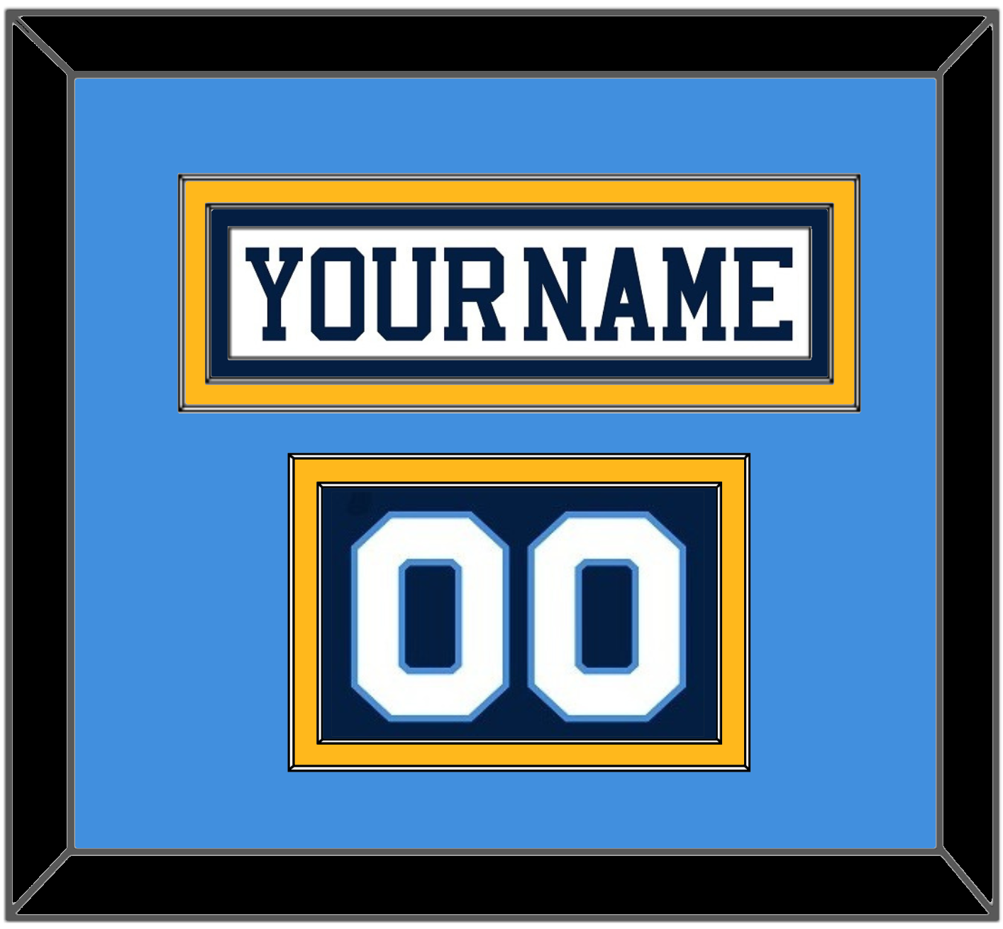 Pittsburgh Home White Jersey (1977 Through 1980) Nameplate & Numbers From Shoulder - Powder Blue Mat Over A Gold Mat With The White Nameplate & Numbers Mounted On A Blue Mat. White Or Black Frame.