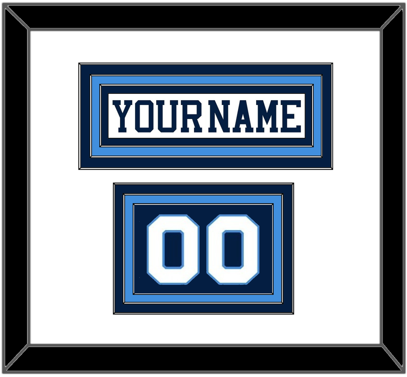 Pittsburgh Home White Jersey (1977 Through 1980) Nameplate & Numbers From Shoulder.  Triple Mat Cut:  White Mat Over A Blue Mat Over A Powder Blue Mat.  White Nameplate & Numbers Mounted On A Blue Mat.  Black Frame.
