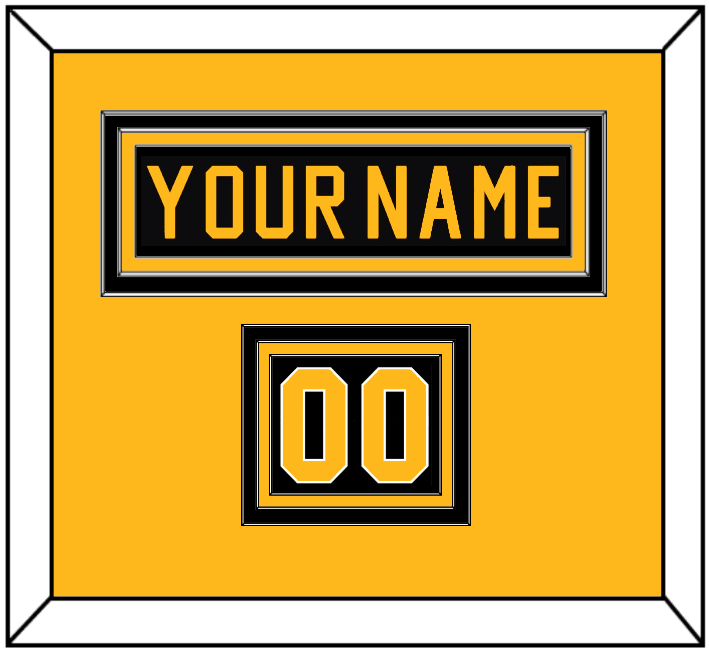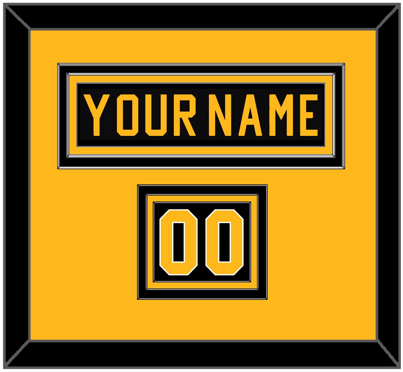 Pittsburgh Road Black Jersey (1981 Through 1984) Nameplate & Numbers From Shoulder - The Nameplate Is Double Mat Cut: Gold Mat Over A Black Mat. Black Nameplate Mounted On A Gold Mat. To Match The Jersey, The Numbers Are Double Mat Cut: Gold Mat Over A Black Mat, Over A Gold Mat. Gold Numbers Mounted On A Black Mat. Black Or White Frame.