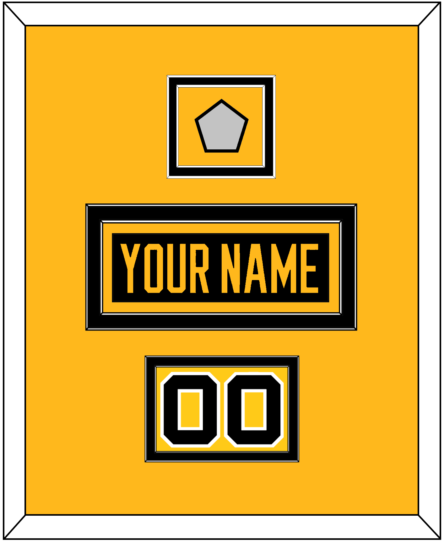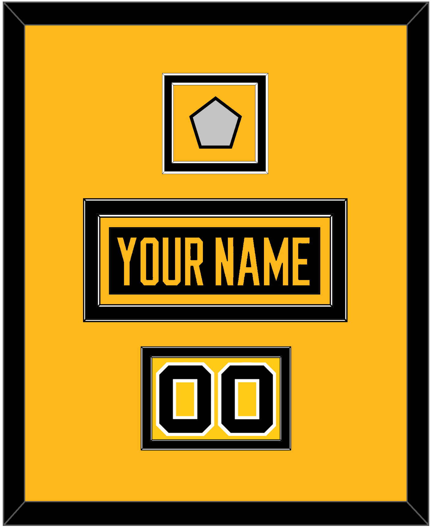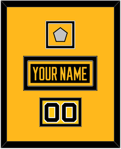 Pittsburgh Home Black Jersey Nameplate, Number(s) From Shoulder, & 1991, 1992, 2009, 2016 Or 2017 Stanley Cup Champions Patch. Double Mat Cut: Gold Mat Over A Black Mat. Black Nameplate, Number And Patch Mounted On A Gold Mat. Black Or White Frame.