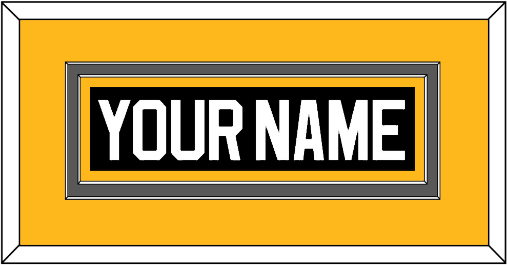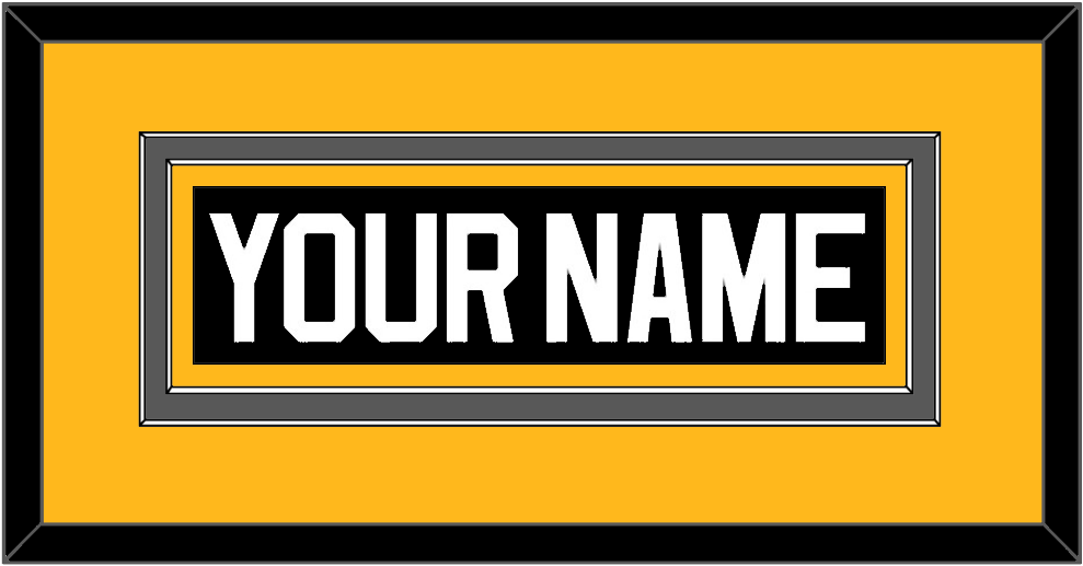 Pittsburgh Road/Alternate Black Jersey (1995 Through 2002) Nameplate. Double Mat: Gold Mat Over Dark Gray Mat, Black Nameplate Mounted On Gold Mat. Black Or White Frame.