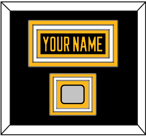 Pittsburgh Home Black Jersey Nameplate & 1991, 1992, 2009, 2016 Or 2017 Stanley Cup Champions Patch. The Nameplate & Patch Are Triple Mat Cut: Black Mat Over A Gold Mat Over A White Mat. Black Nameplate & Patch Mounted On A Gold Mat. White Frame.