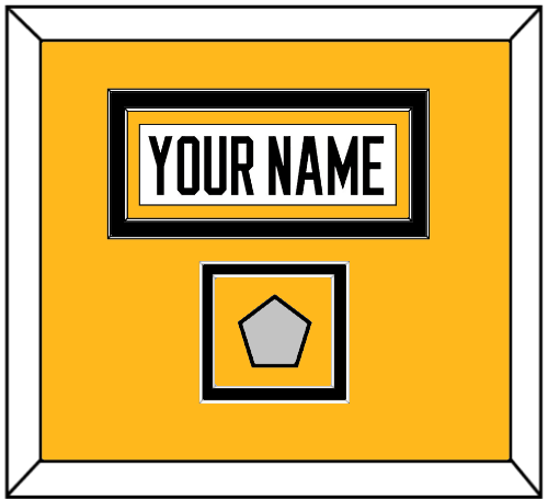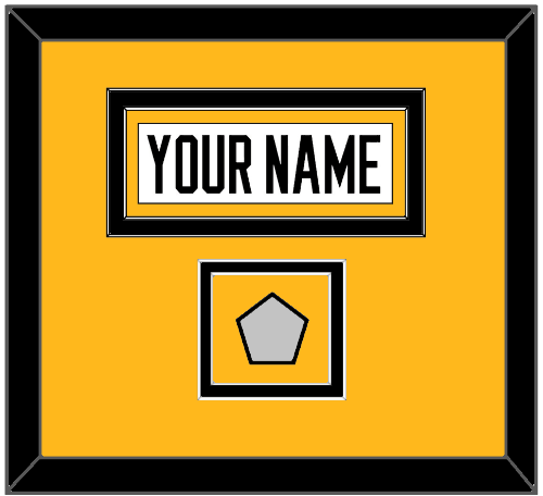 Pittsburgh Home White Jersey (1988 Through 1992) Nameplate With 1991, 1992, 2009, 2016 Or 2017 Stanley Cup Champions Patch.  Double Mat Cut:  Gold Mat Over A Black Mat With White Nameplate & Patch Mounted On A Gold Mat.  Black Or White Frame.