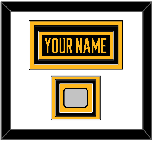 Pittsburgh Home Black Jersey Nameplate & 1991, 1992, 2009, 2016 Or 2017 Stanley Cup Champions Patch.  The Nameplate & Patch Are Triple Mat Cut:  White Mat Over A Gold Mat Over A Black Mat.  Black Nameplate & Patch Mounted On A Gold Mat.  BlackFrame.