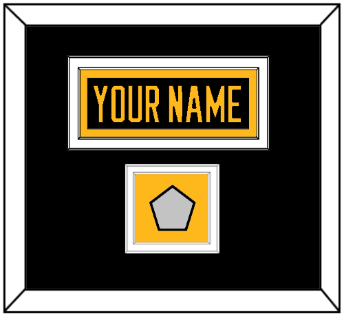 Pittsburgh Home Black Jersey Nameplate With 1991, 1992, 2009, 2016 Or 2017 Stanley Cup Finals Patch. Double Mat Cut: Black Mat Over A White Mat With Black Nameplate & Patch Mounted On A Gold Mat. White Frame.