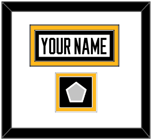 Pittsburgh Home White Jersey (1988 Through 1992) Nameplate With 1991, 1992, 2009, 2016 Or 2017 Stanley Cup Champions Patch. Double Mat Cut: White Mat Over A Gold Mat With White Nameplate & Patch Mounted On A Black Mat. Black Frame.