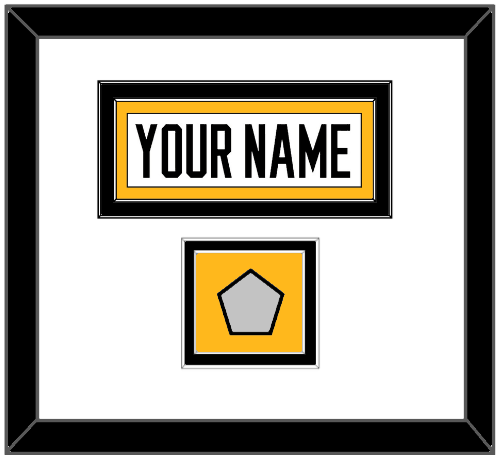 Pittsburgh Home White Jersey (1988 Through 1992) Nameplate With 1991, 1992, 2009, 2016 Or 2017 Stanley Cup Champions Patch. Double Mat Cut: White Mat Over A Black Mat With White Nameplate & Patch Mounted On A Gold Mat. Black Frame.