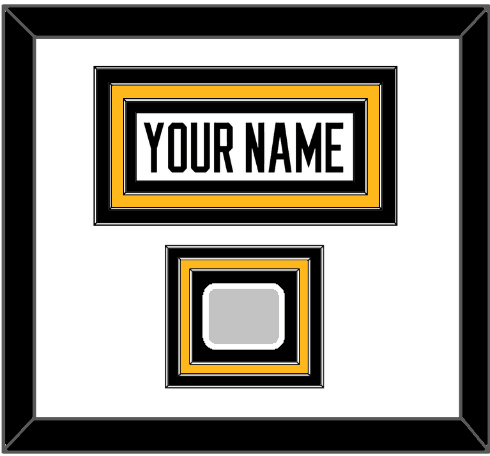 Pittsburgh Home White Jersey (1988 Through 1992) Nameplate & 1991, 1992, 2009, 2016 Or 2017 Stanley Cup Finals Jersey Patch. The Nameplate & Patch Are Triple Mat Cut: White Mat Over A Black Mat Over A Gold Mat. White Nameplate & Patch Mounted On A Black Mat. Black Frame.