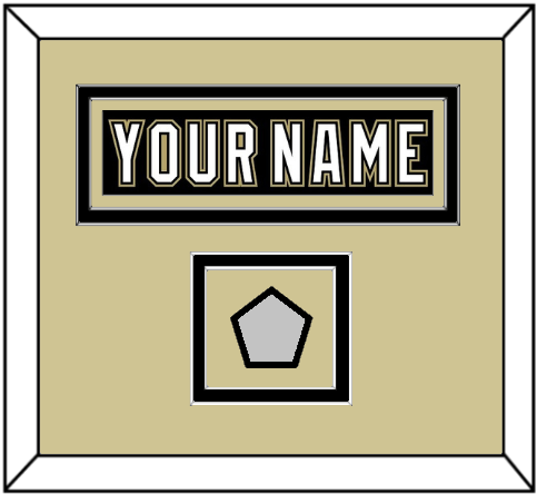 Pittsburgh Home Black Jersey (2007 Through 2016) Nameplate With 1991, 1992, 2009, 2016 Or 2017 Stanley Cup Finals Patch.  Double Mat Cut:  Gold Mat Over A Black Mat With Black Nameplate & Patch Mounted On A Gold Mat.  Black Or White Frame.