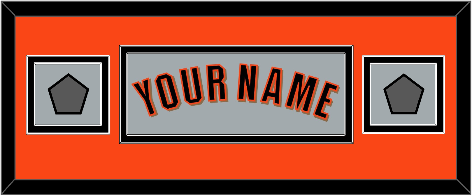 San Francisco Road Gray Jersey (2010 Through 2021) Name With 2010 & 2012 Or 2012 & 2014 World Series Champions Patches. Double Mat Cut: Orange Mat Over A Black Mat. Black Name & Patches Mounted On A Gray Mat. Black Frame.
