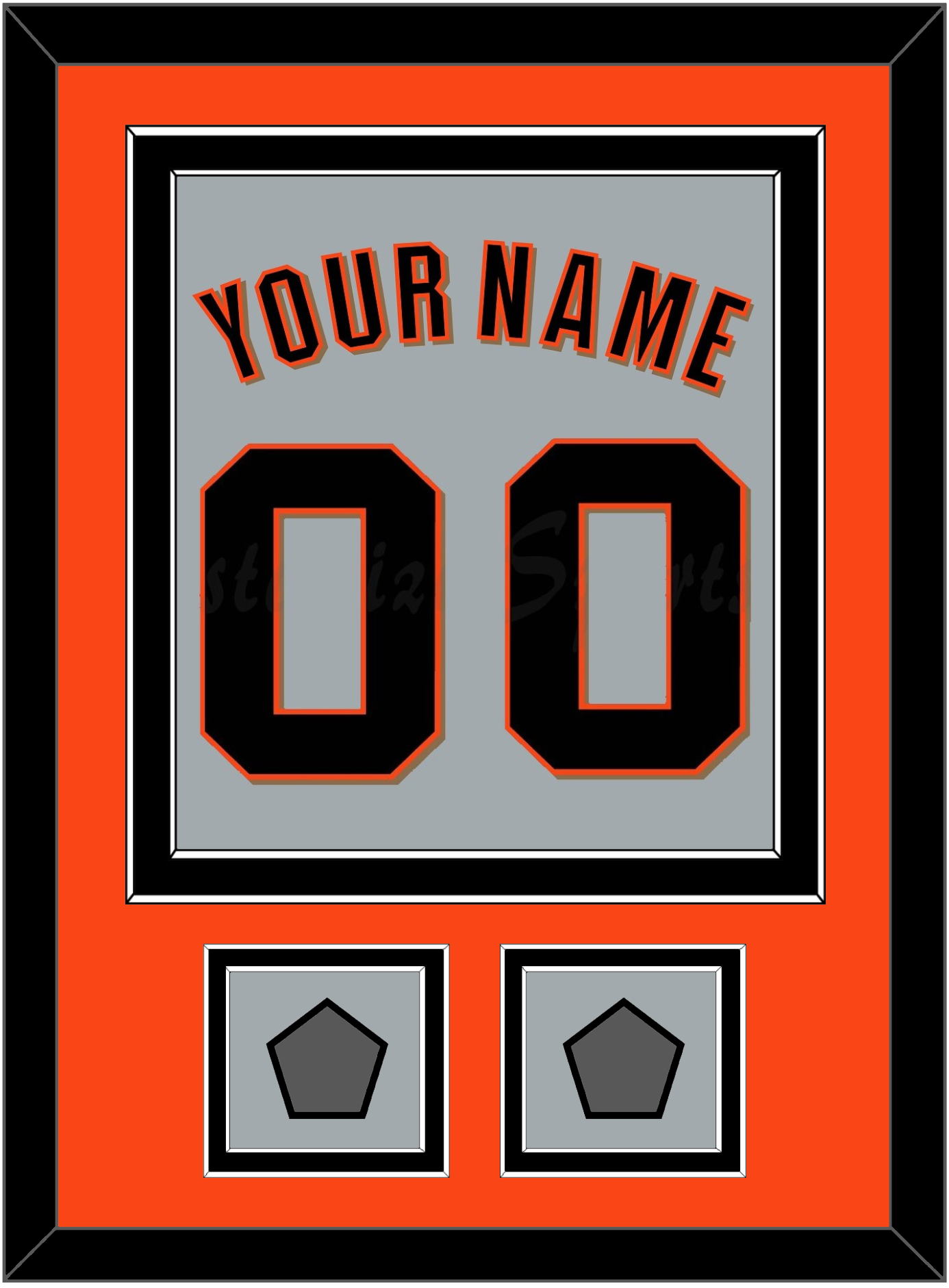 San Francisco Road Gray Jersey (2010 Through 2021) Name, Number & Two World Series Champions Patches (2010 & 2012 Or 2012 & 2014). Double Mat Cut: Orange Mat Over A Black Mat. Black Name, Number & Patches Mounted On A Gray Mat. Black Frame.