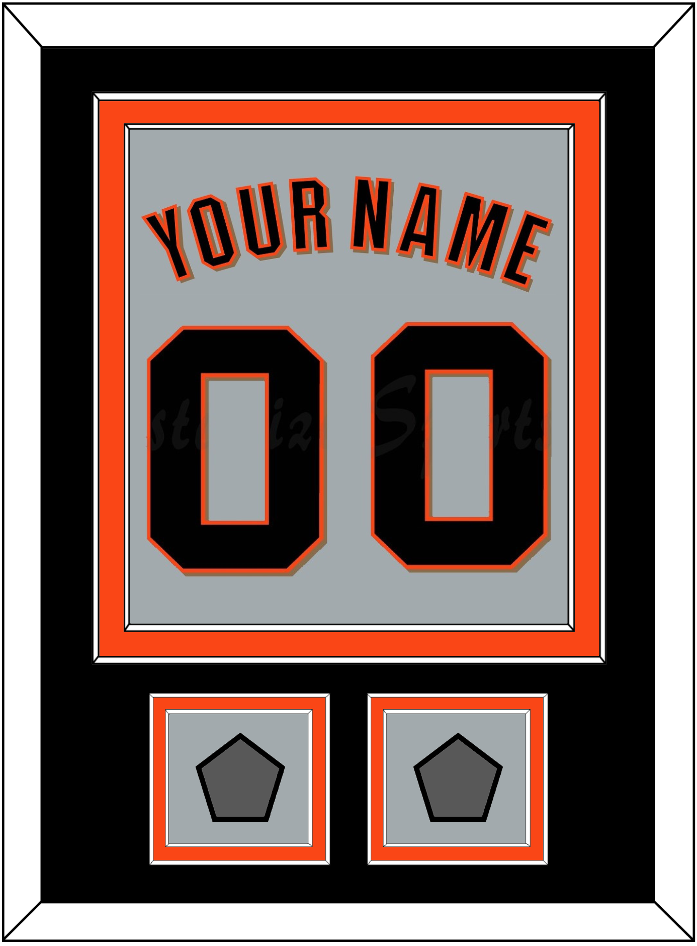 San Francisco Road Gray Jersey (2010 Through 2021) Name, Number & Two World Series Champions Patches (2010 & 2012 Or 2012 & 2014). Double Mat Cut: Black Mat Over An Orange Mat. Black Name, Number & Patches Mounted On A Gray Mat. White Frame.
