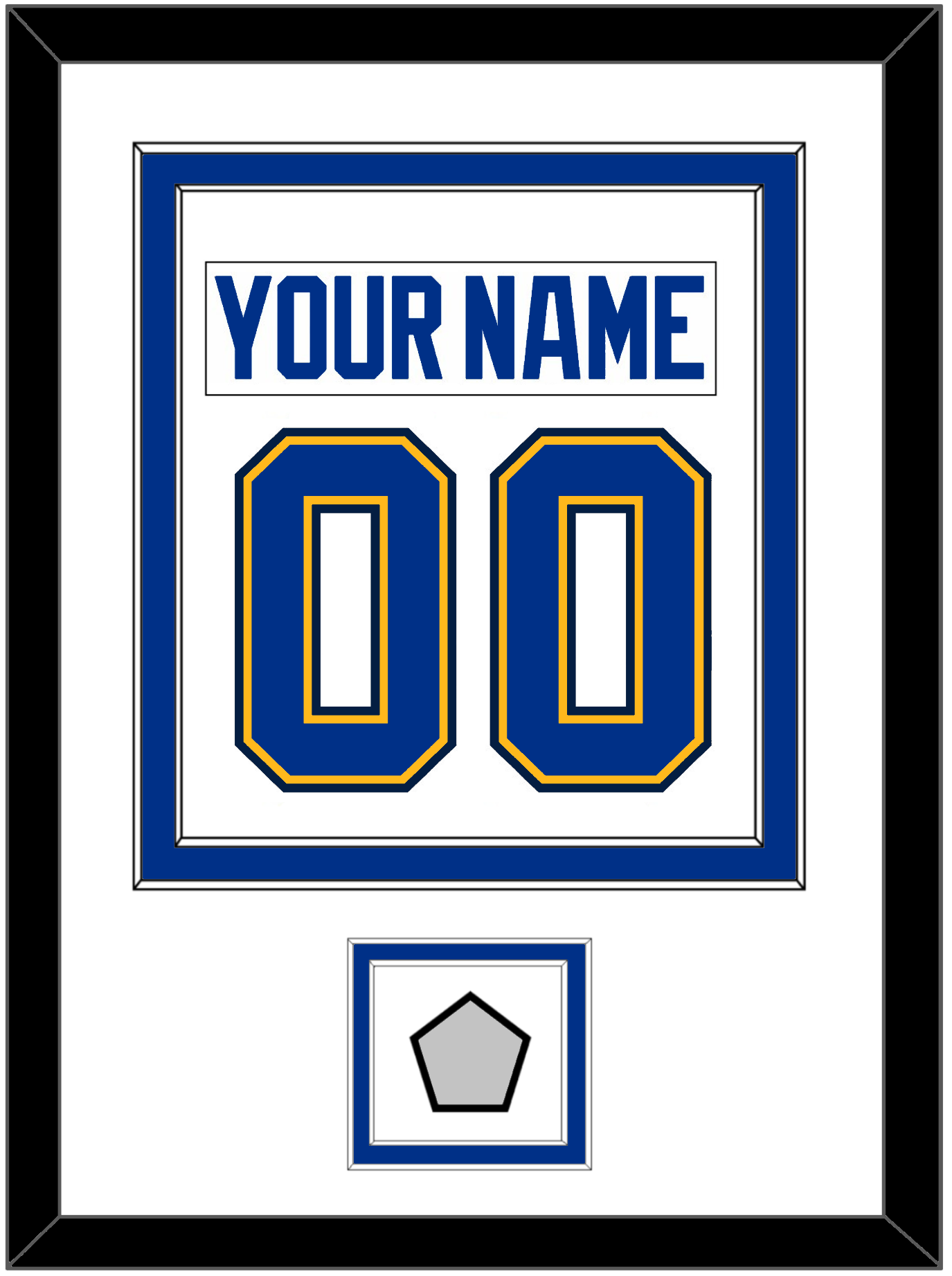 St. Louis Road White Jersey (2017 Through 2025) Nameplate & Number (From The Back Of The Jersey) With 2019 Stanley Cup Finals Patch. Double Mat Cut: White Mat Over A Blue Mat. White Nameplate, Blue Number & Patch Mounted On A White Mat. Black Frame.