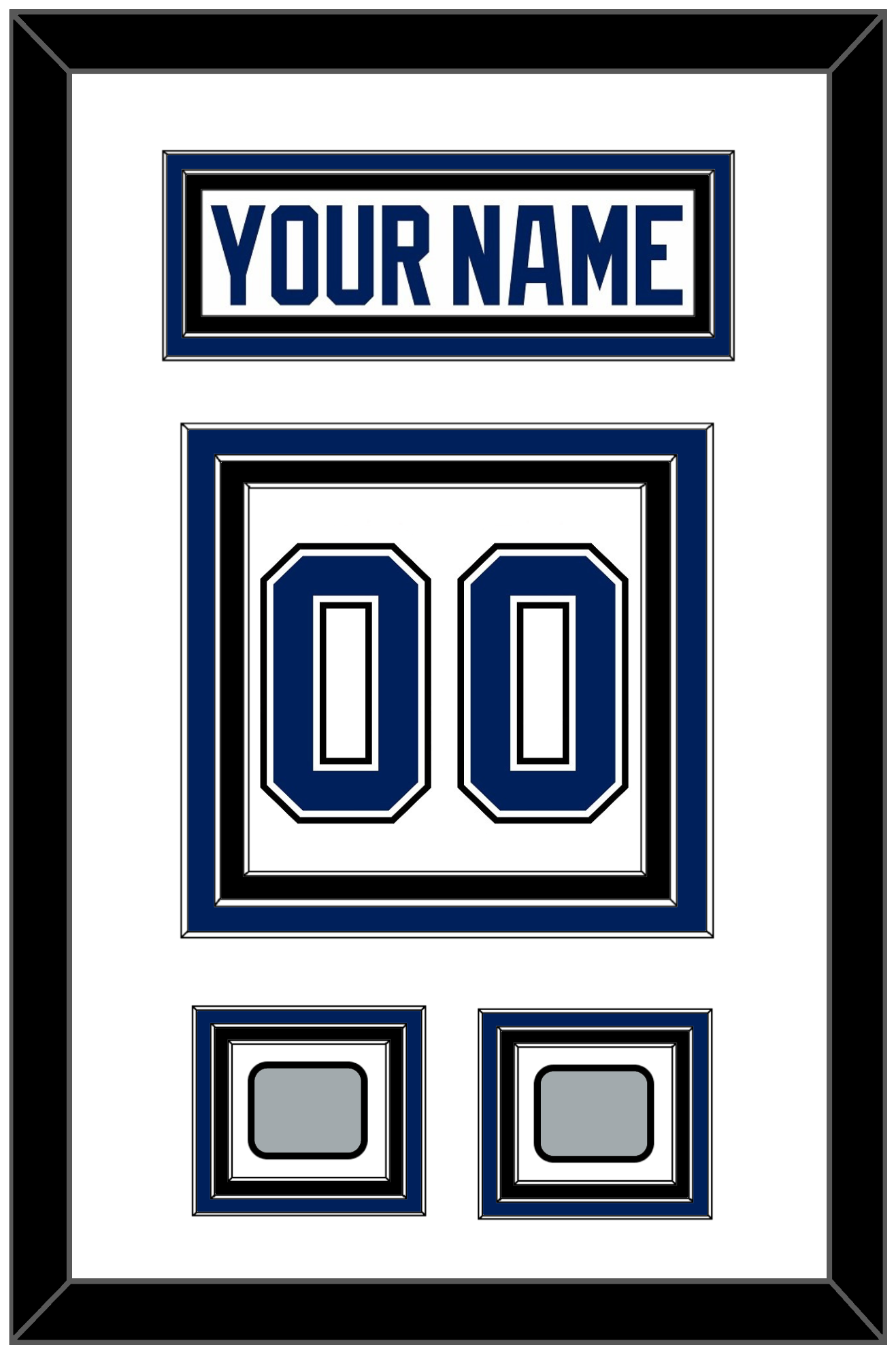 Tampa Bay Road White Jersey Nameplate & Numbers (From The Back Of The Jersey) With 2020 & 2021 Stanley Cup Finals Patches. Nameplate Is Double Mat Cut: White Mat Over A Blue Mat. White Nameplate Mounted On A Black Mat. To Match The Jersey, Number Is Triple Mat Cut: White Mat Over A Blue Mat Over A Black Mat. Blue Number & Patches Mounted On A White Mat. Black Frame.