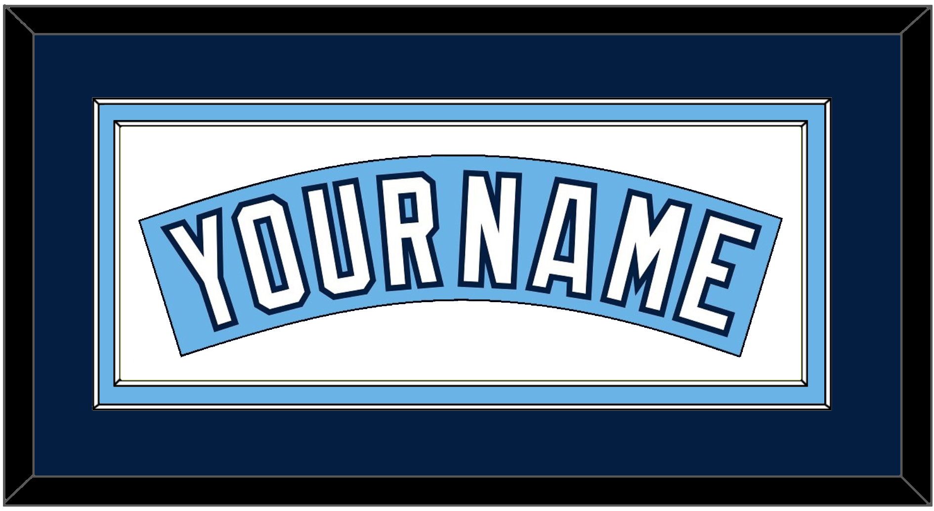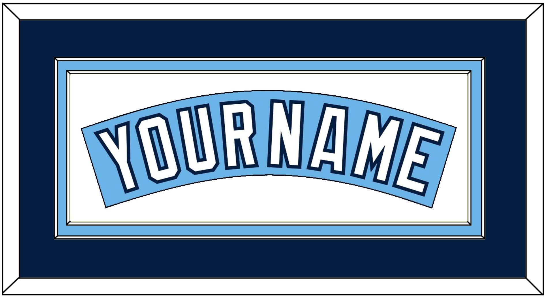 Tampa Bay Alternate Columbia Blue Jersey (2010 Through 2018) Nameplate. Double Mat: Navy Mat Over A Columbia Blue Mat. Columbia Blue Nameplate Mounted On A White Mat. White Or Black Frame.