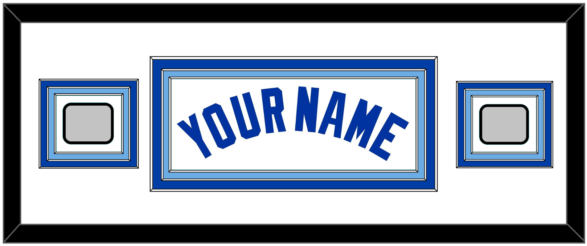 Toronto Home White Jersey (1981 Through 1996) Name With 1992 & 1993 World Series Patches. Triple Mat: White Mat Over A Blue Mat Over A Light Blue Mat. Blue Name & Patches Mounted On A White Mat. Black Frame.