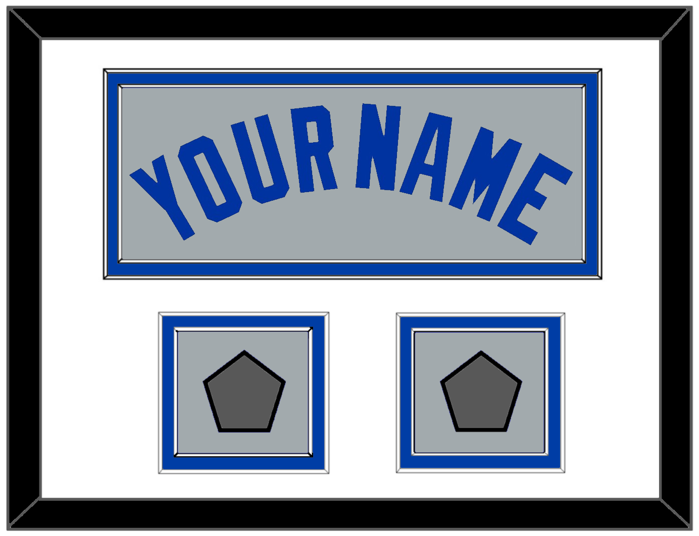 Toronto Road Gray Jersey (1989 Through 1996) Name With 1992 & 1993 World Series Patches. Double Mat: White Mat Over A Blue Mat. Blue Name & Patches Mounted On A Gray Mat. Black Frame.