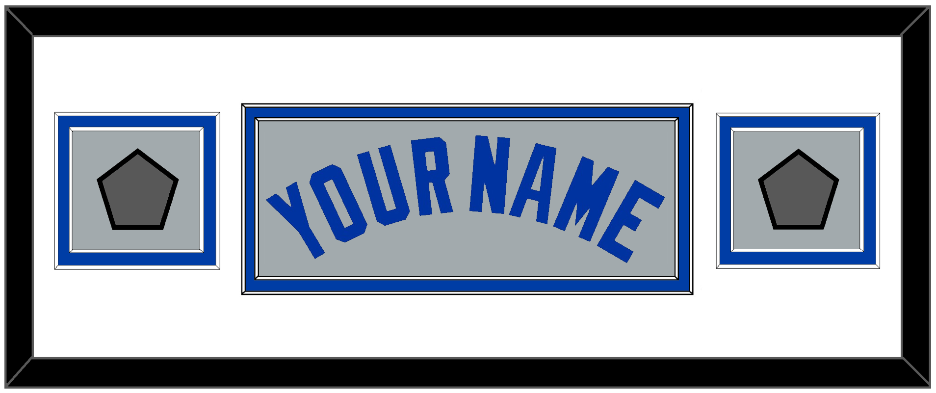 Toronto Road Gray Jersey (1989 Through 1996) Name With 1992 & 1993 World Series Patches. Double Mat: White Mat Over A Blue Mat. Blue Name & Patches Mounted On A Gray Mat. Black Frame.