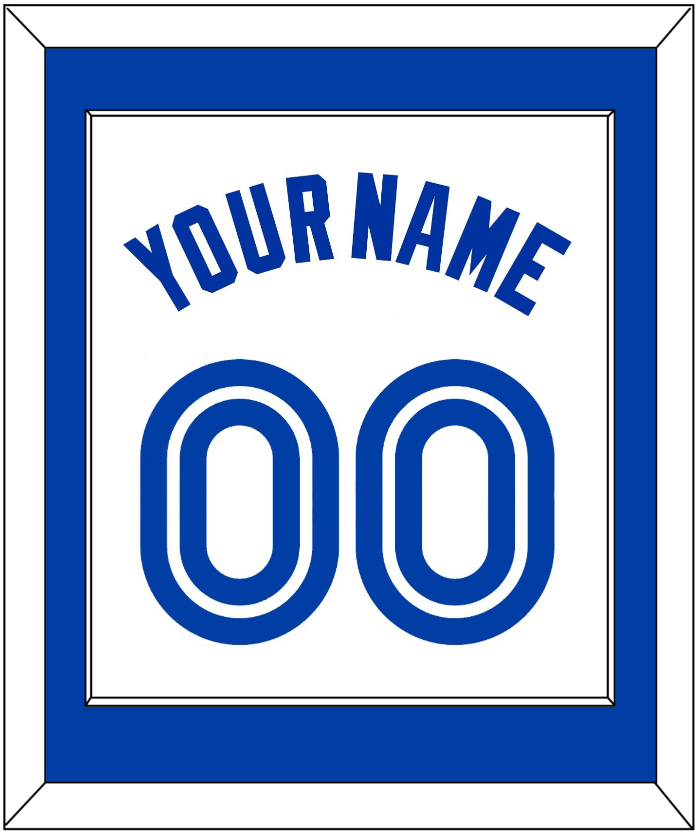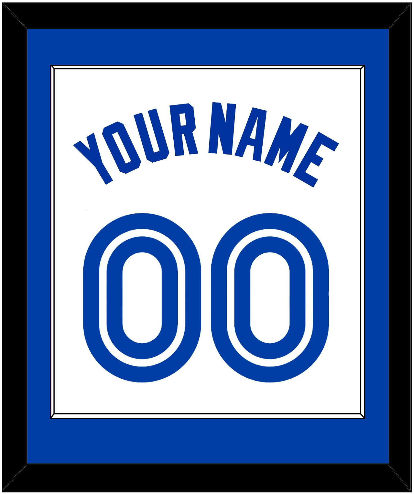 Toronto Home White Jersey (1981 Through 1996) Name & Number.   Single Mat:  Blue Mat With Blue Name And Number Mounted On White Mat.  White Or Black Frame.
