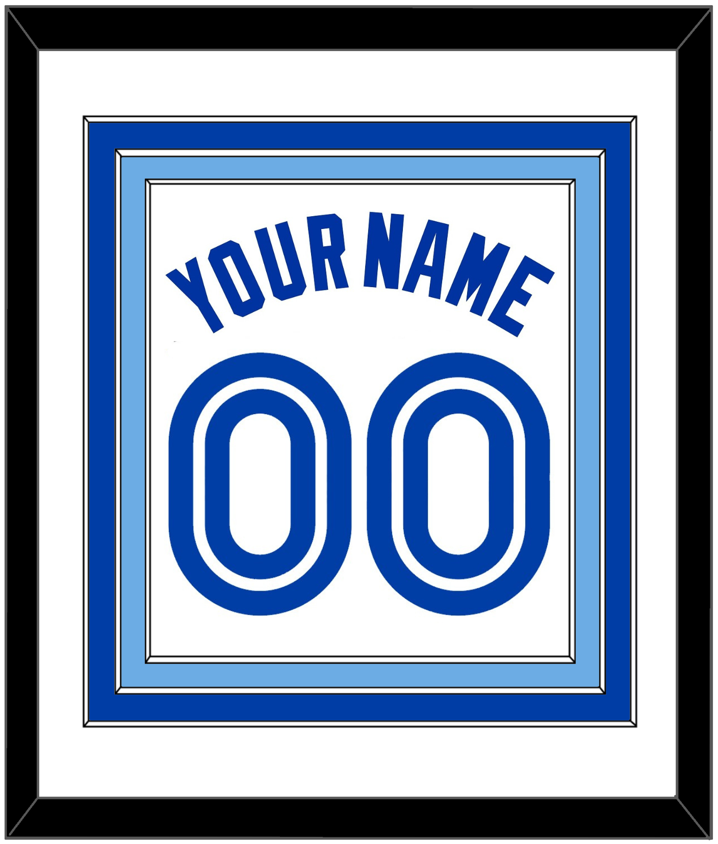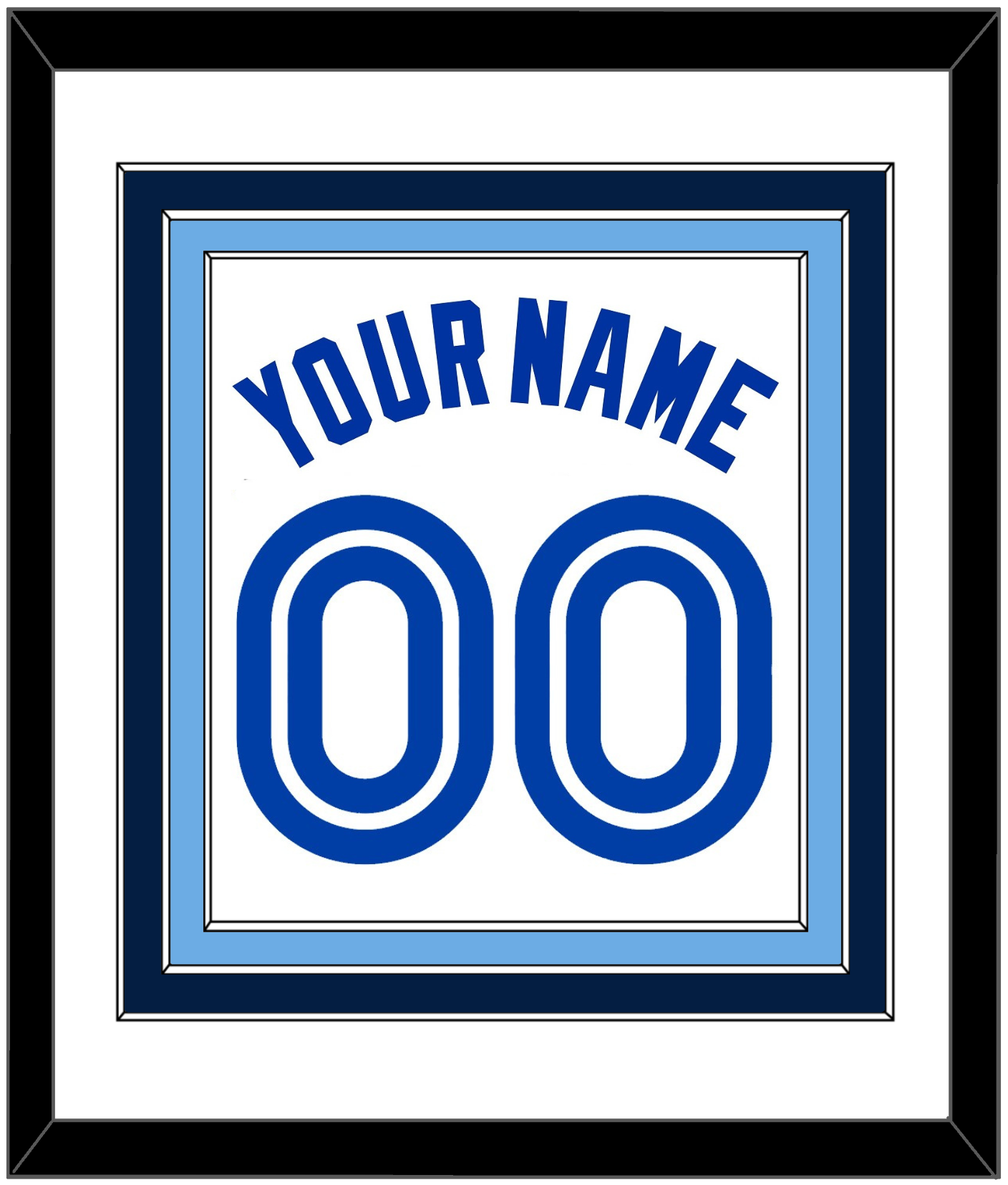 Toronto Home White Jersey (1981 Through 1996) Name & Number.   Triple Mat:  White Mat Over A Blue Mat Over A Light Blue Mat.  Blue Name And Number Mounted On White Mat.  Black Frame.