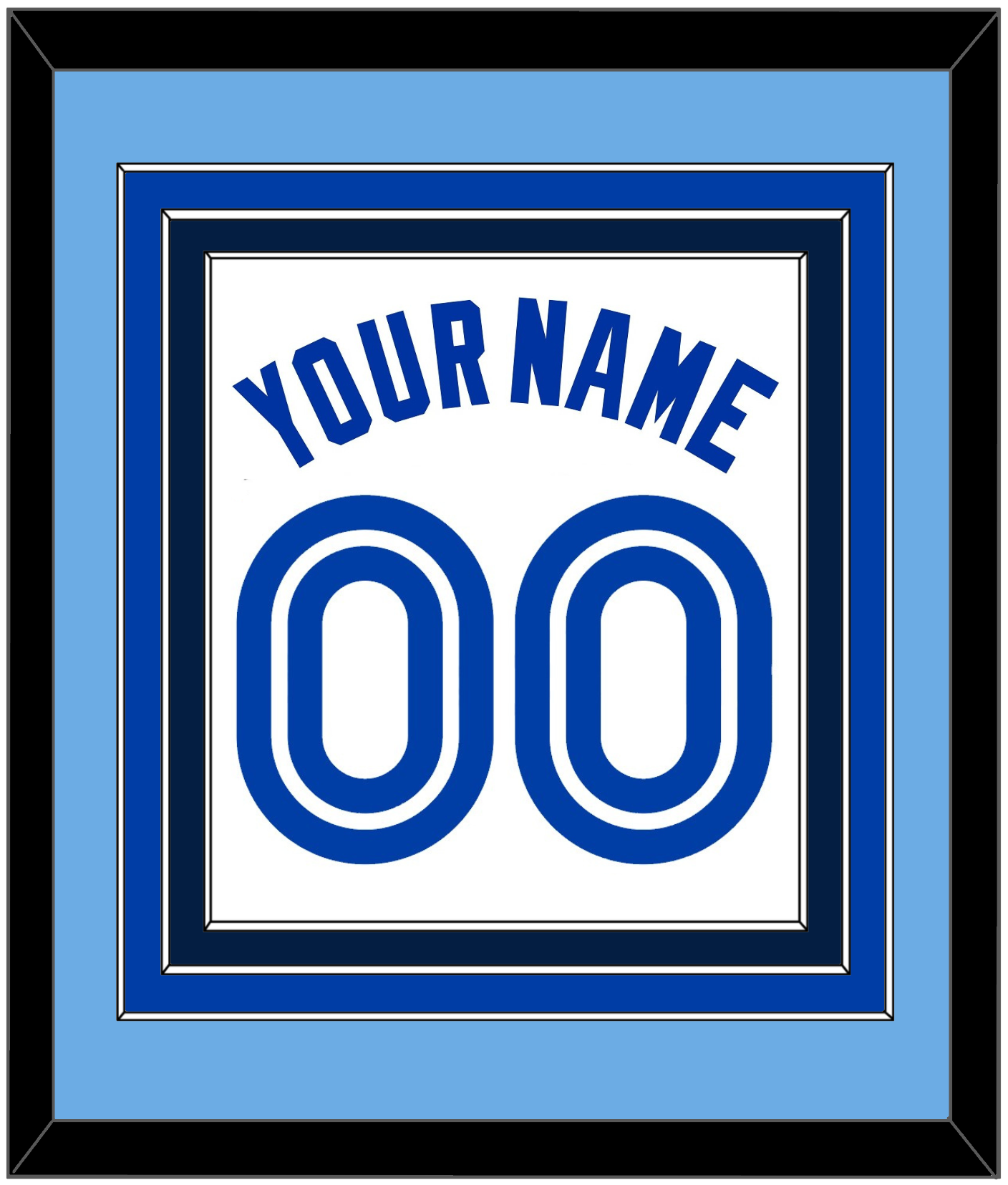 Toronto Home White Jersey (1981 Through 1996) Name & Number. Triple Mat: Light Blue Mat Over A Blue Mat Over A Navy Blue Mat. Blue Name And Number Mounted On White Mat. White Or Black Frame.